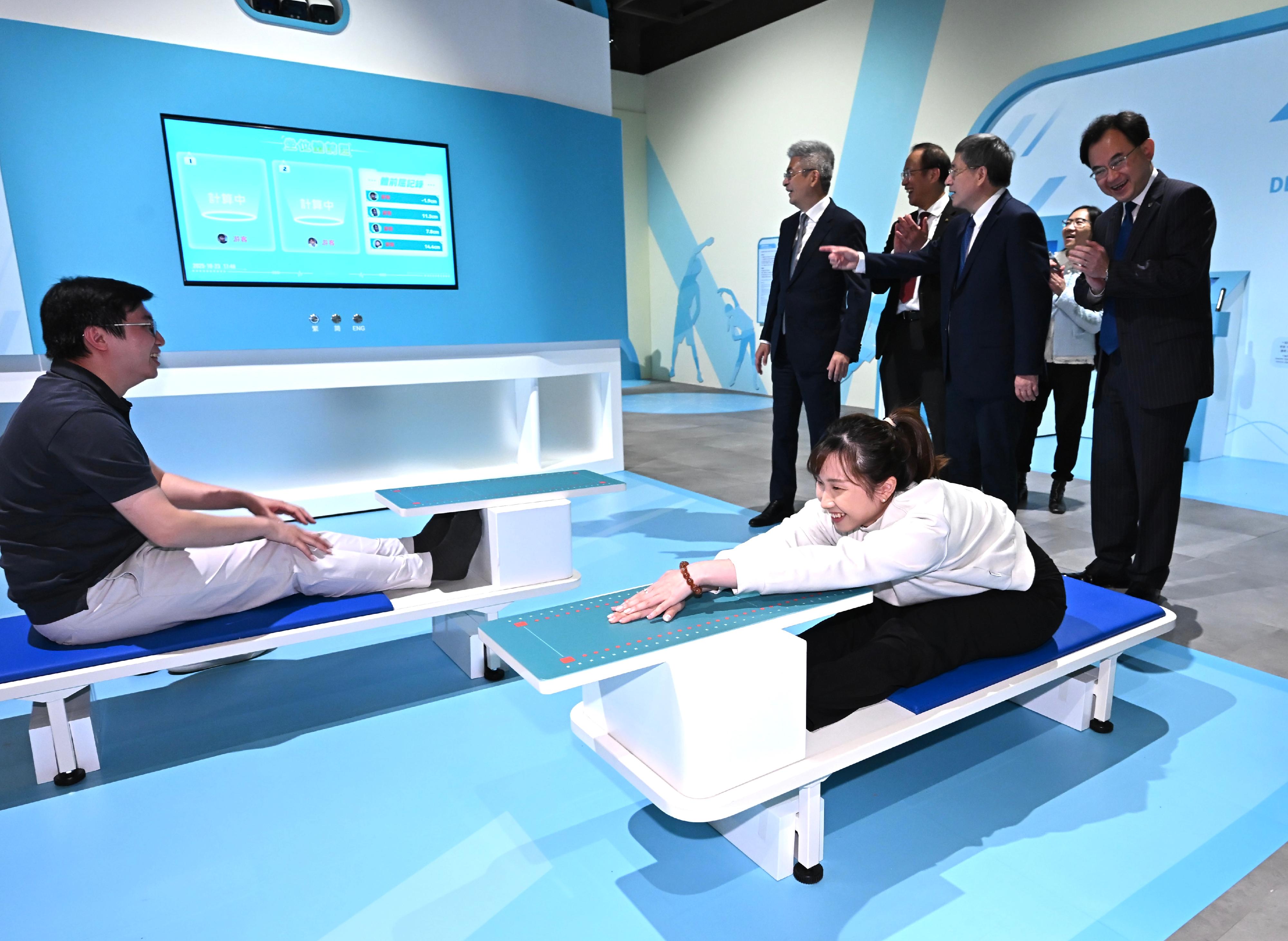 Wushu athlete Juanita Mok (front row, right) experiences the interactive exhibit "Health Fitness" during the launching of “Bank of China (Hong Kong) Presents: National Development and Achievements Series - Approaching Perfection: The Intersection of Sports and Science” exhibition, Oct 23, 2025. (PROVIDED TO CHINA DAILY)