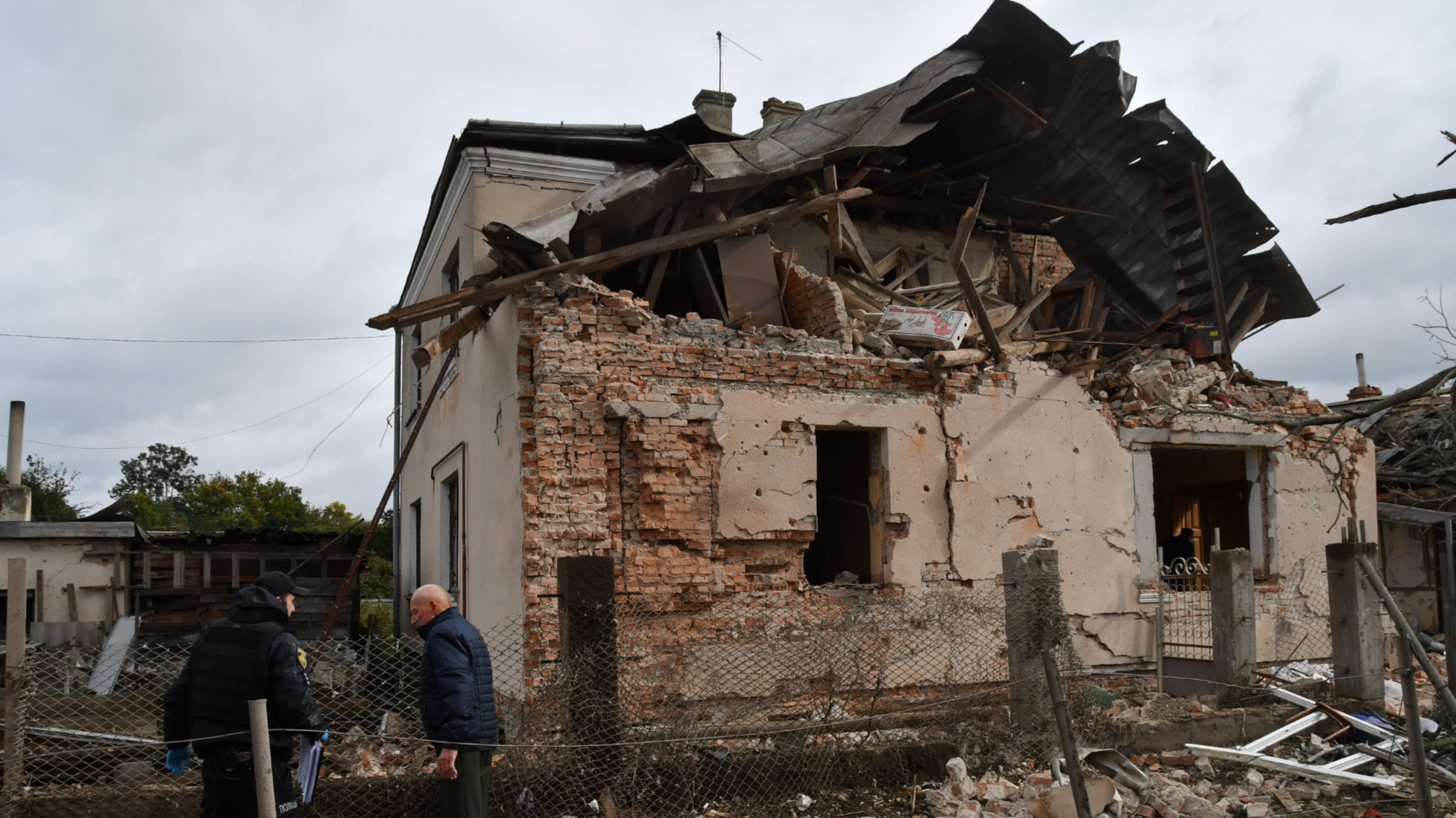 A rescuer and a civilian check the debris of a destroyed house following a Russian rocket strike on the outskirts of Lviv, Ukraine, Oct 5, 2025. (PHOTO / AP)