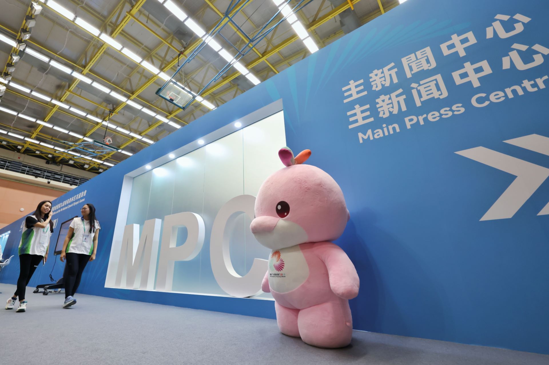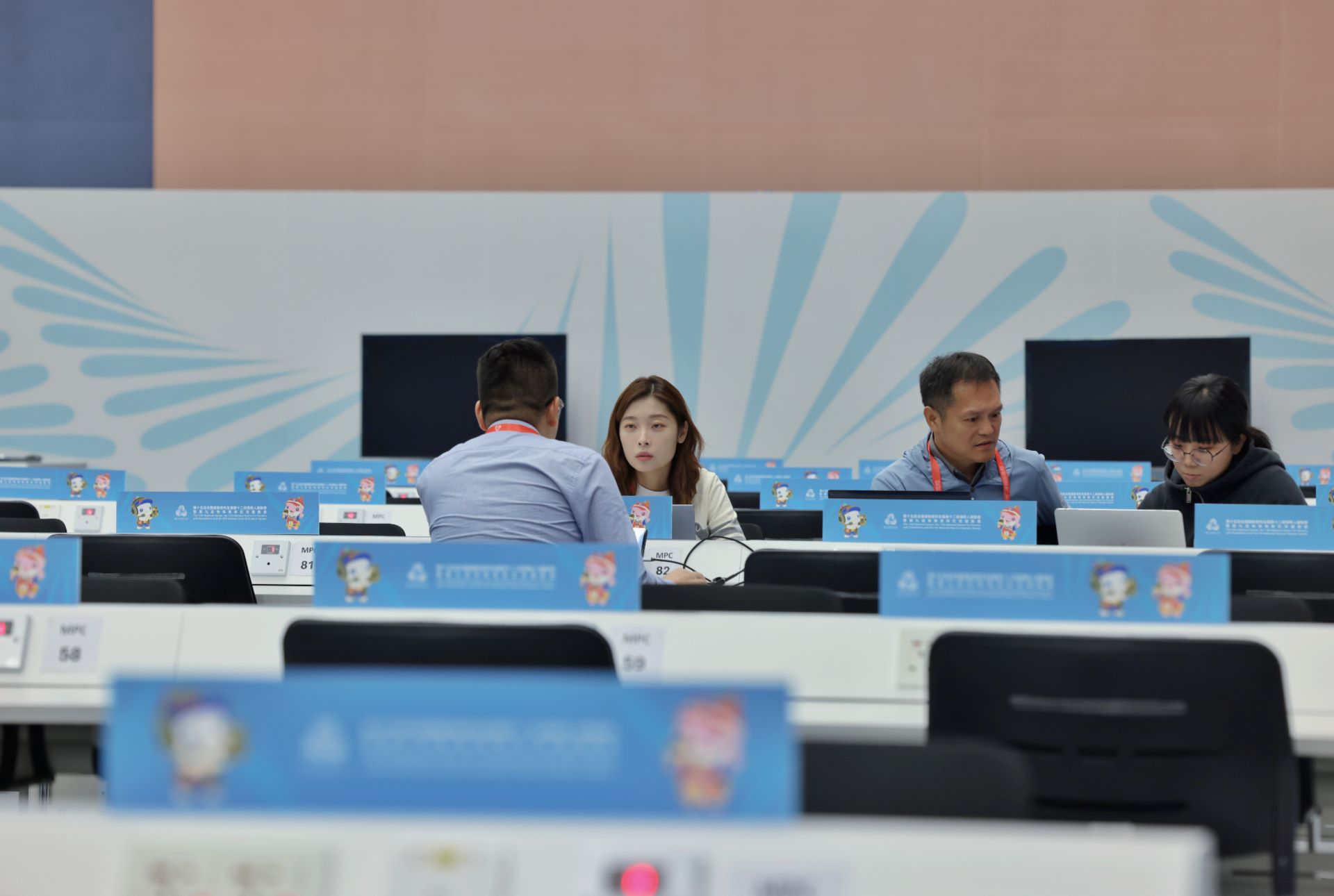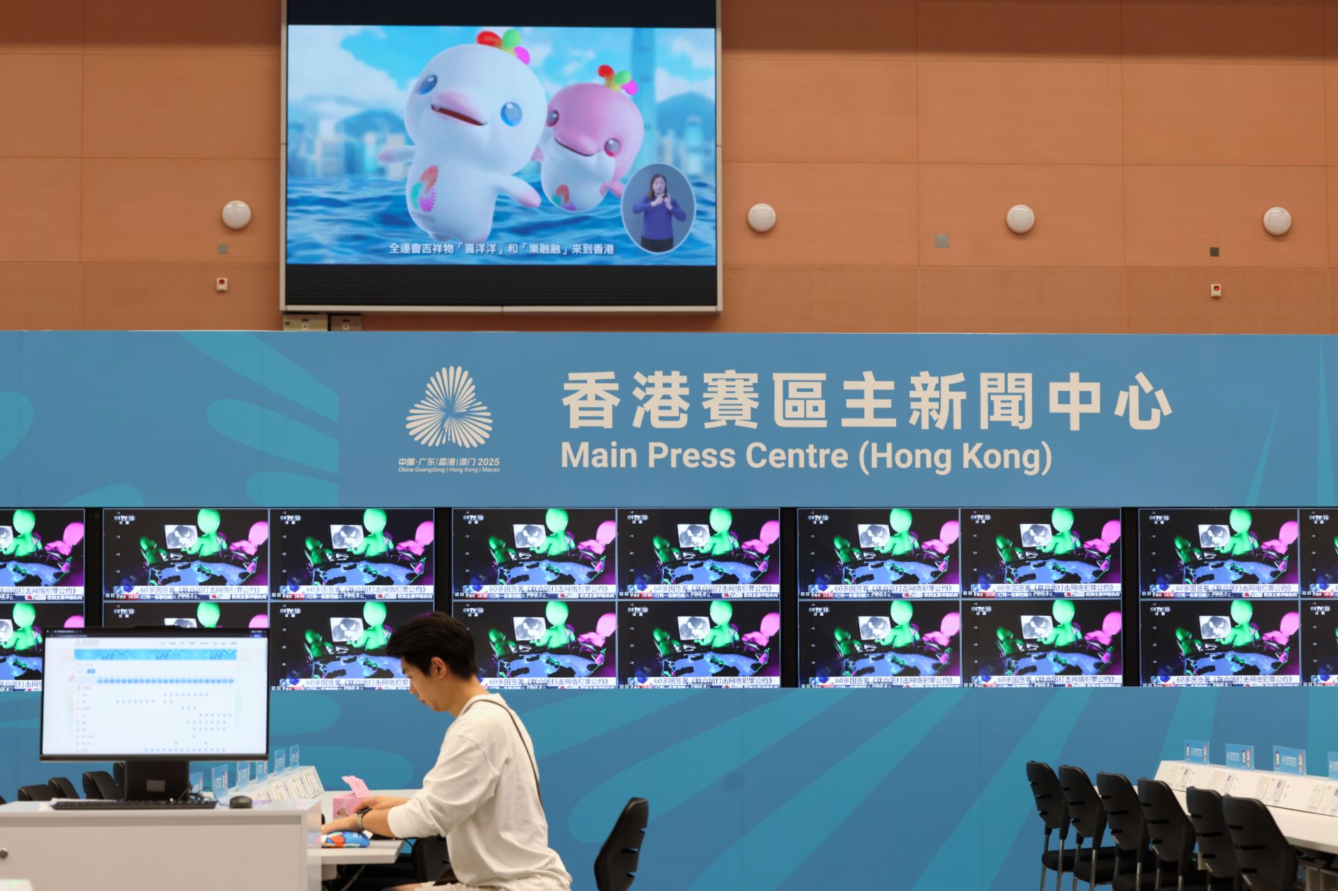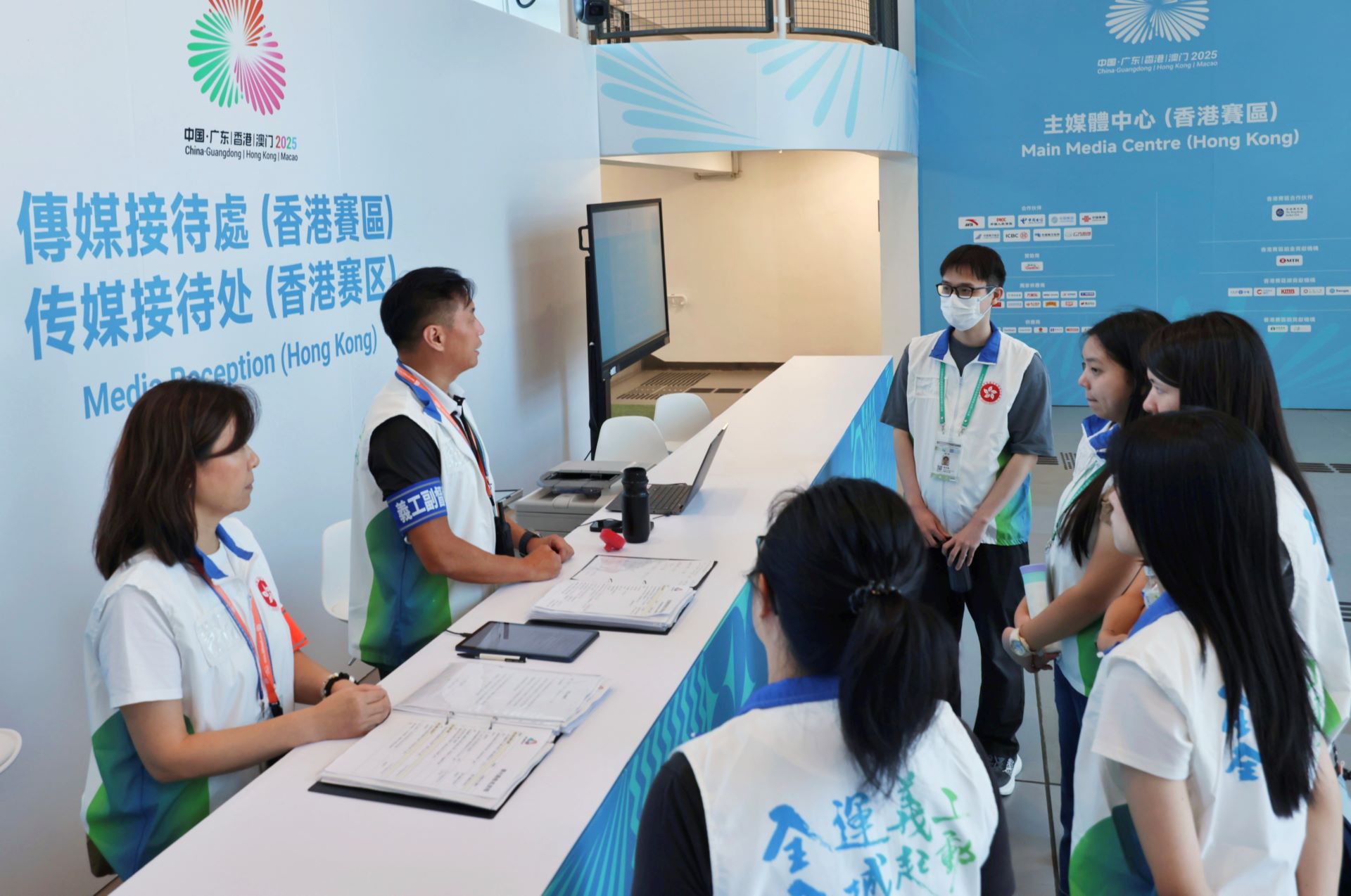 This photo dated Oct 26, 2025 shows staff volunteers of the Main Press Centre (Hong Kong) for the 15th National Games at the Sun Yat Sen Memorial Park Sports Centre in Sai Ying Pun. (PARKER ZHENG/CHINA DAILY)