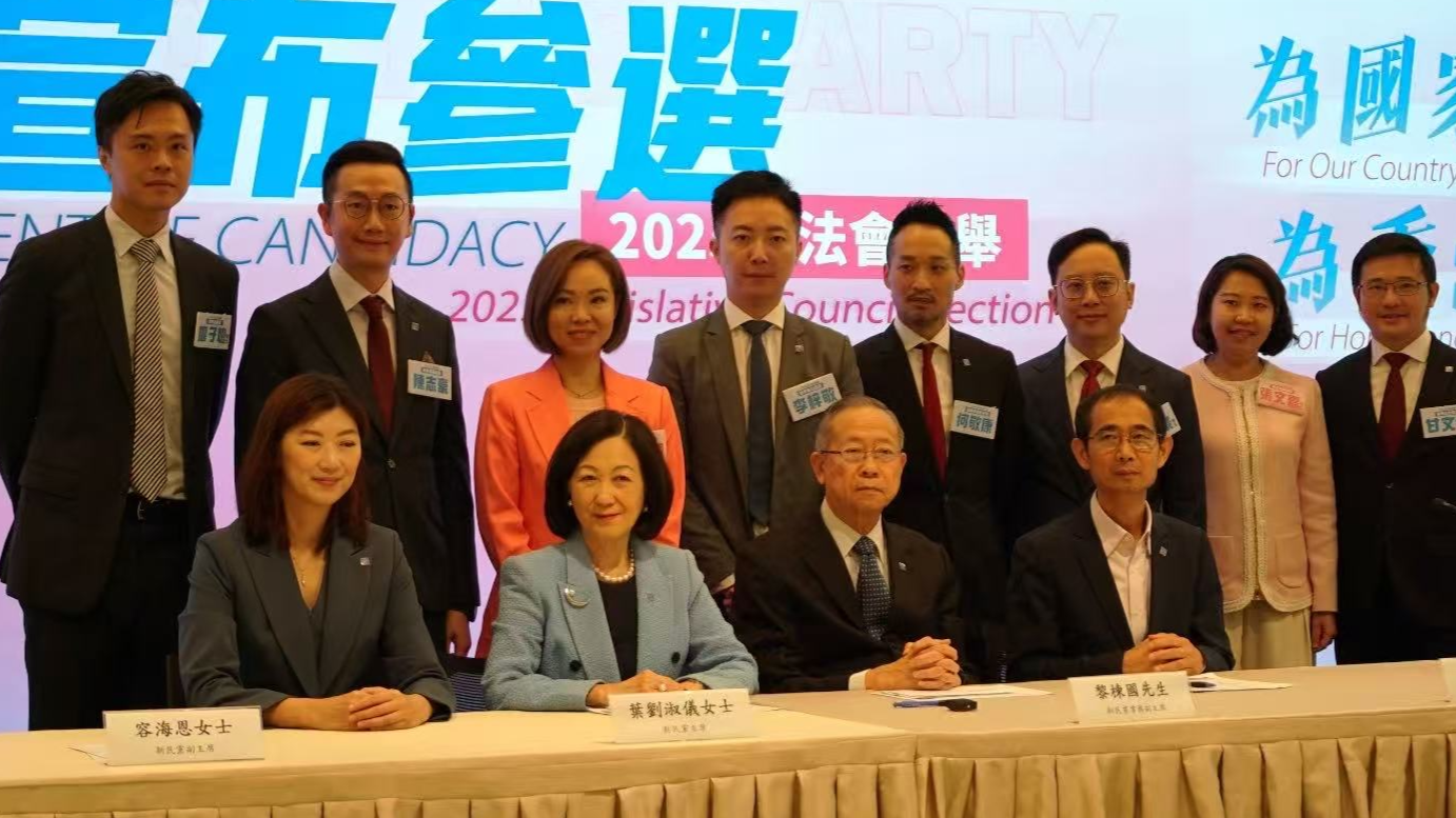 Regina Ip Lau Suk-yee (front row, second left), chairwoman of the New People’s Party, announced on Saturday (Oct 25, 2025) she’ll step aside in the LegCo elections on Dec 7, and outlined the party’s slate for the upcoming polls. (JESSICA CHEN / CHINA DAILY)
