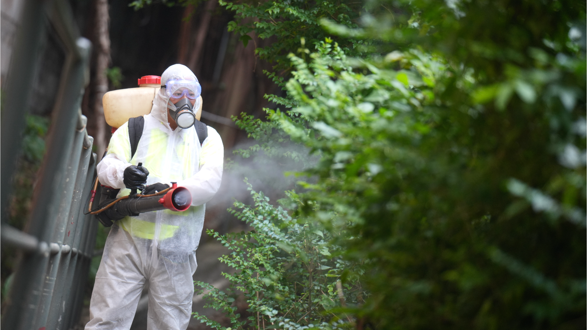 Food and Environmental Hygiene Department deploys staffs to disperse anti-mosquito spray around hill area opposite at Rhenish Church Grace School in Diamond Hill on Oct 28, 2025. (ADAM LAM / CHINA DAILY)