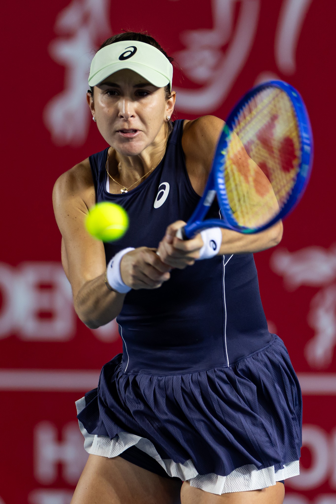 In this photo released by the Hong Kong Tennis Open on its official Facebook page, Belinda Bencic of Switzerland hits a return to Russia's Aliaksandra Sasnovich during the Hong Kong Tennis Open on Oct 28, 2025.