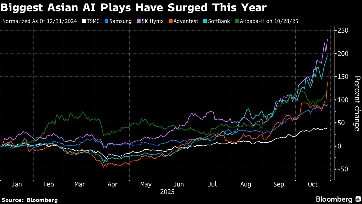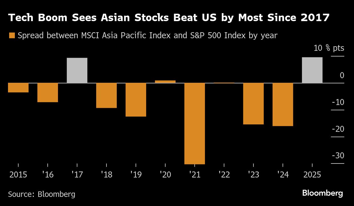 Asia’s chipmakers have seen their market values soar, with TSMC crossing the $1 trillion mark in July. Investors chasing beneficiaries of the tidal wave of hyperscaler spending on AI have pushed the MSCI Asia Pacific Index up 26 percent this year, on track to beat the S&P 500 by the most in eight years.