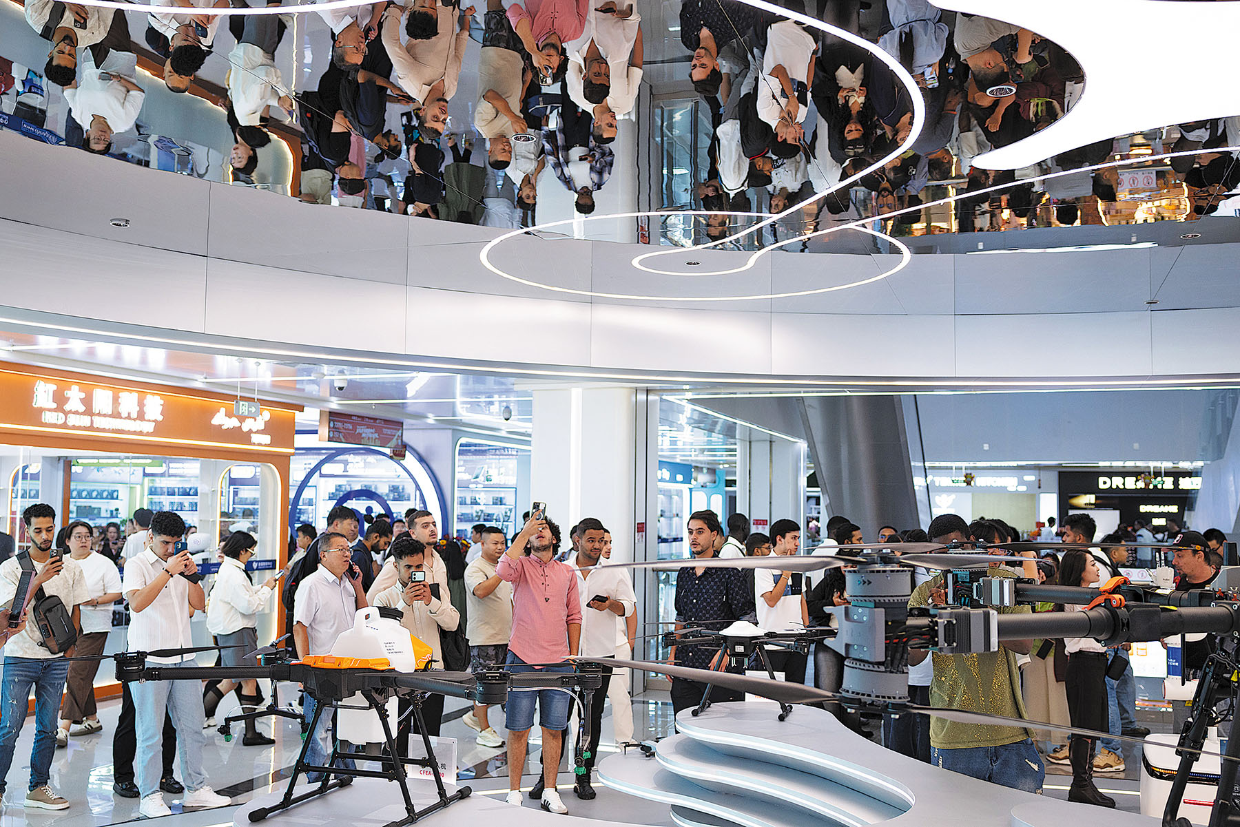 Visitors from overseas take photos of unmanned aerial vehicle products at the Global Digital Trade Center in Yiwu, Zhejiang province, on Oct 14, 2025. (NI YANQIANG / FOR CHINA DAILY)