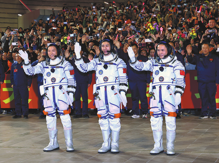 Shenzhou XXI astronauts, Senior Colonel Zhang Lu (right), Major Wu Fei (center) and Zhang Hongzhang, attend a departure ceremony on Friday at the Jiuquan Satellite Launch Center in northwestern China. (WANG JIANGBO / FOR CHINA DAILY)