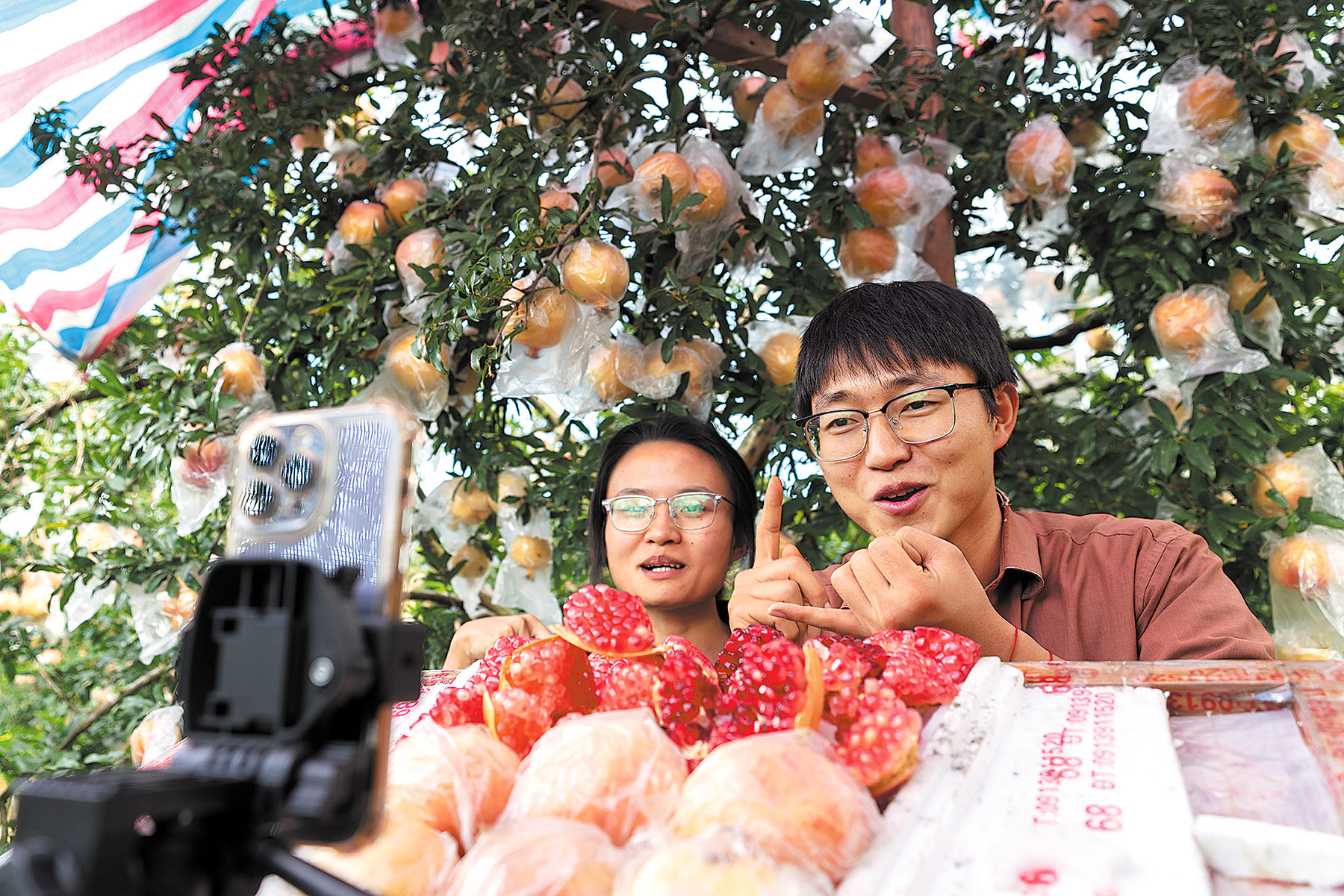 Wu Haitao (right) and Li Min, who returned to their hometown after graduating from college, promote pomegranates online at their orchard in Mengzi, Yunnan province, on Oct 15, 2025. (PHOTO / XINHUA)