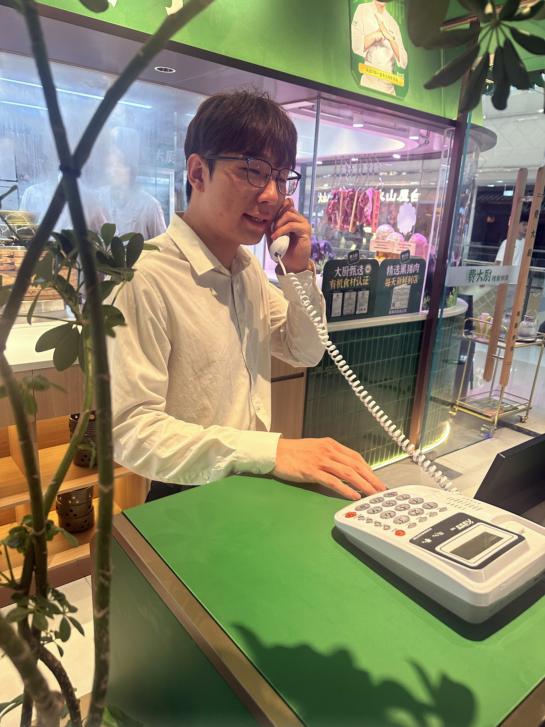 Wu Yun'e answers calls from customers at a Chef Fei restaurant in Zhengzhou, Henan province, in August 2025. (PROVIDED TO CHINA DAILY)