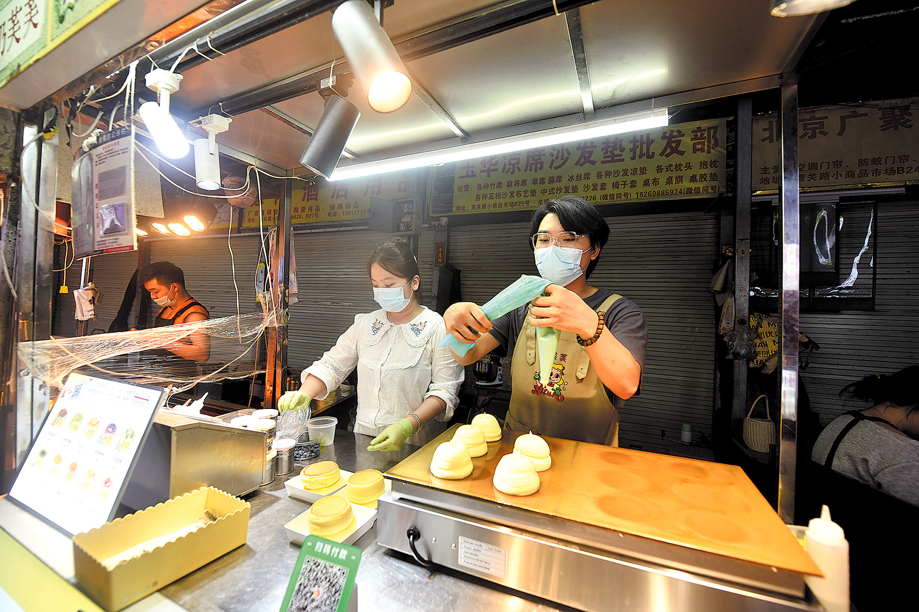 Lu Yiding (right) and his girlfriend Wang Fufu make cakes on their stand at a night market in Nanning, Guangxi Zhuang autonomous region, in May. Lu had initially tried to start his own business while at university in 2018. After quitting his job in 2023, he chose to run a stall at a night market. (PHOTO / XINHUA)