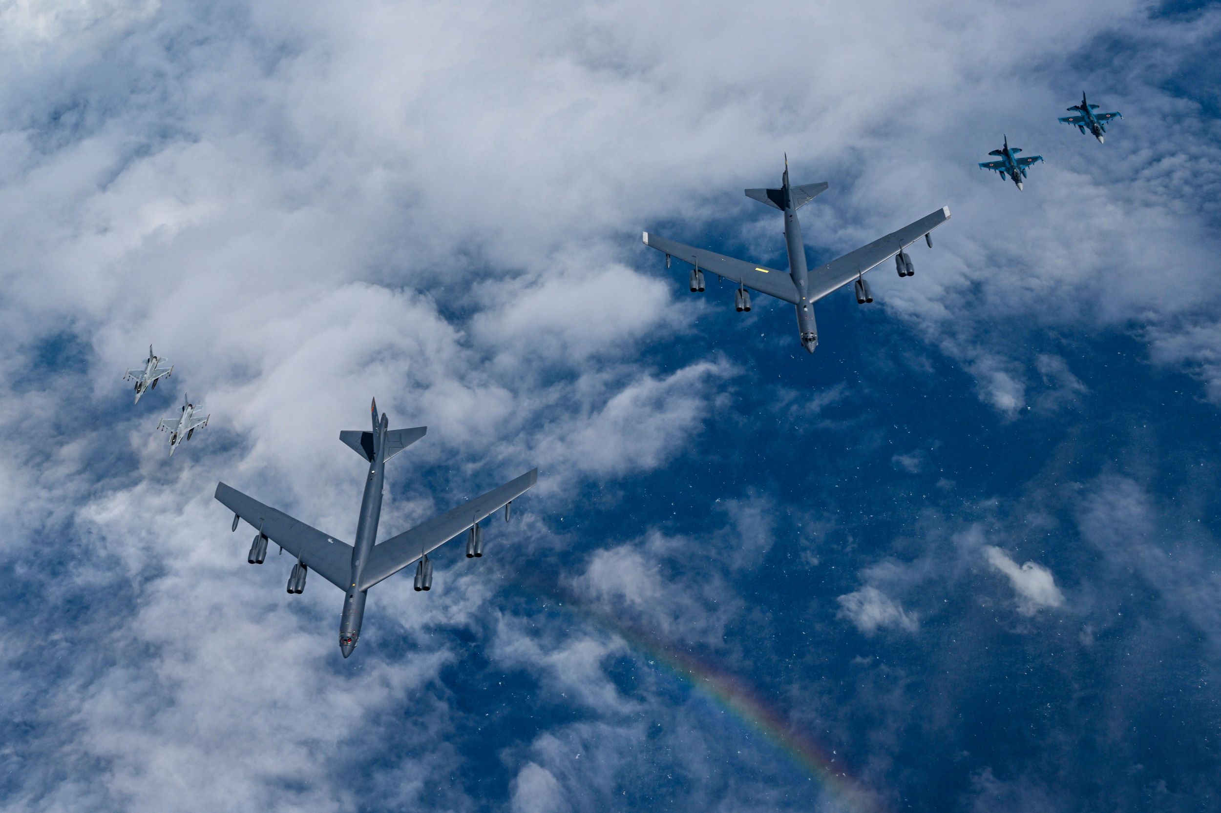 This handout photo taken on July 11, 2025 and provided by the Defence Ministry of the Republic of Korea shows US Air Force B-52H bombers (center), ROK Air Force KF-16 fighter jets (left) and Japanese Air Self-Defense Force F-2 fighter jets (right) flying in formation during a joint air drill over international waters off the southern ROK island of Jeju. (HANDOUT / ROK DEFENCE MINISTRY / AFP)
