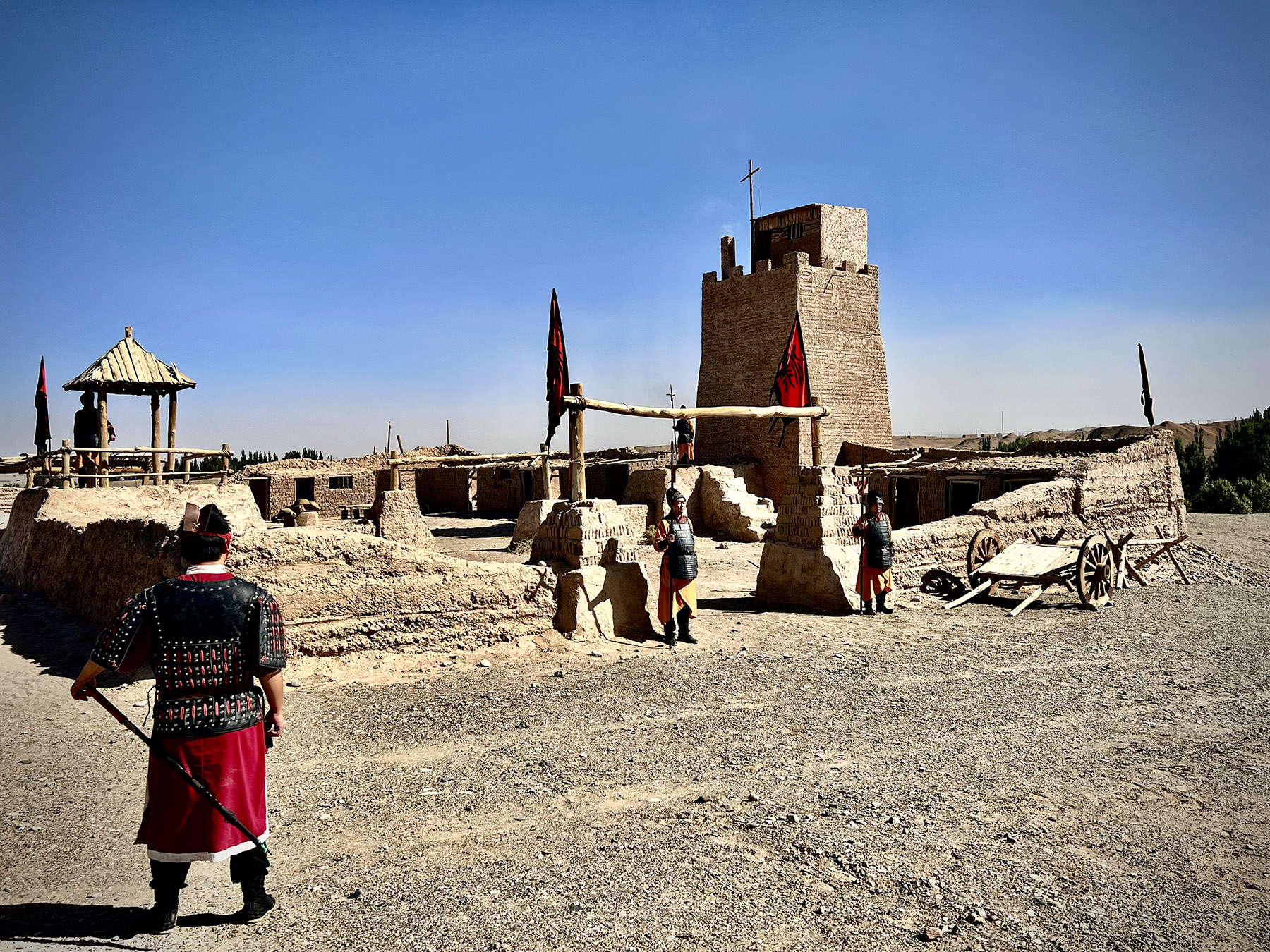 An on-site museum presents swords, arrowheads and a mummified infant that testify to the traversal of borders, not just among nations but between life and death. Today, at Yangguan, performers in period costume don't just bring history to life — they stage live-action role-playing reenactments, journeying across centuries to perform as soldiers and officials. One of the most popular activities for visitors is receiving "travel documents" — like passports to travel through time — scrawled on bamboo slips and ceremoniously presented by an ancient official. Visitors can ride to the Yangguan Beacon Tower in an ancient-style donkey-drawn cart or on camel-back. At a nearby outpost, they can team up with soldiers to start fires using the bow-drill technique, as was employed long ago to incinerate stacks of straw to emit smoke signals in the daytime or flames at night.