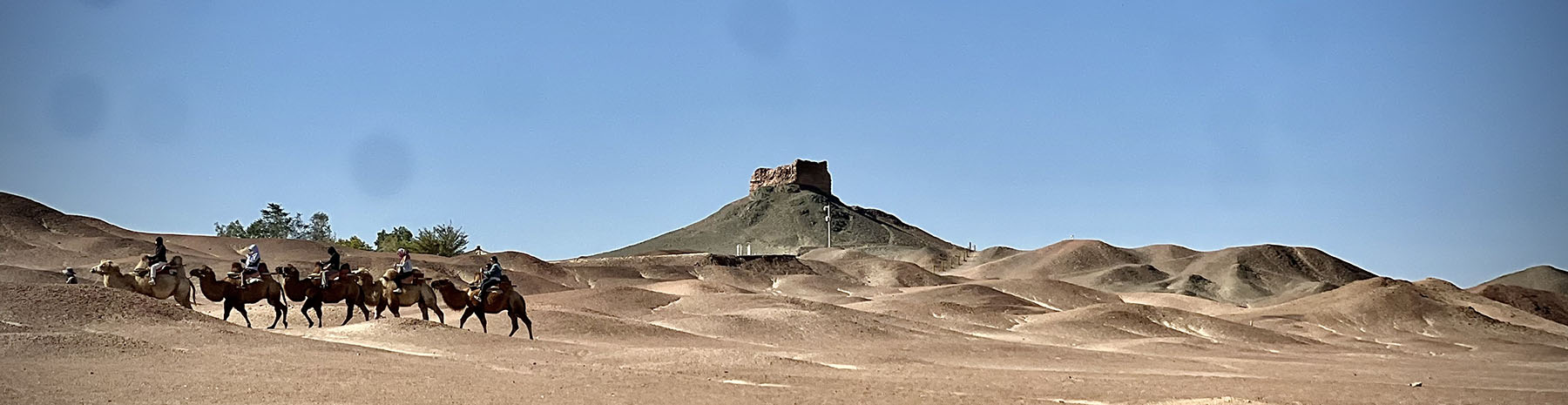 A camel caravan plods past Yangguan's First Beacon Tower, which has been ground to a nub by centuries of erosion. (ERIK NILSSON / CHINA DAILY)