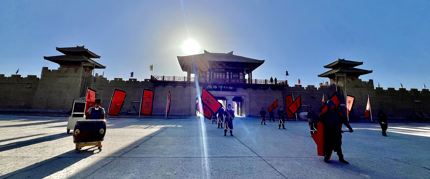 Staff members in period costume greet visitors with performances at Yangguan Pass' main entrance in Dunhuang, Gansu province. (ERIK NILSSON / CHINA DAILY)