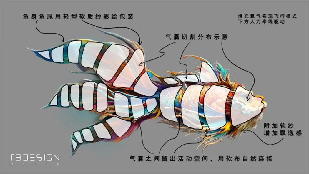A design graphic shows how the lantern uses soft gauze and airbags to create a vivid sense of motion. (PROVIDED TO CHINA DAILY)