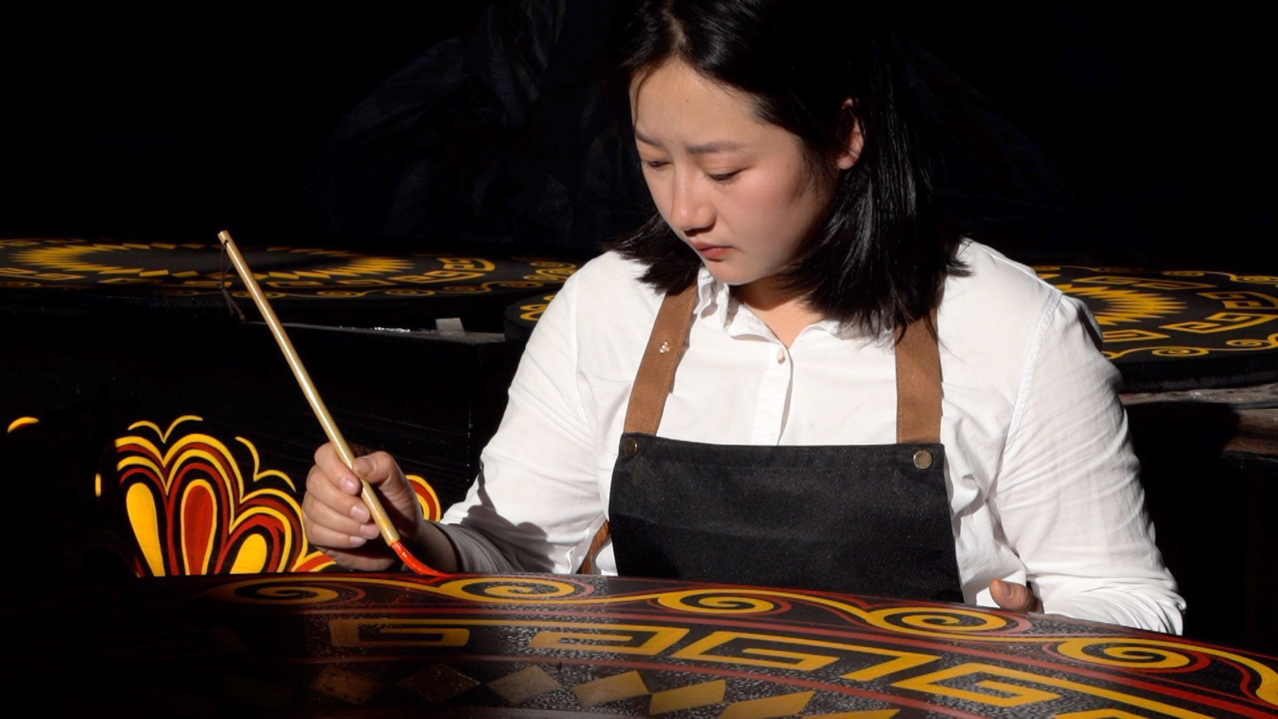 With a paintbrush in hand, Qumu Shiwu patiently draws unique patterns on a piece of lacquerware, freehand yet with unerring precision.