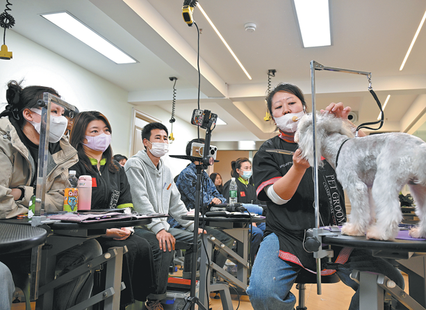 An instructor teaches trainees professional grooming skills at Lele Pet Grooming School in Anshan, Northeast China's Liaoning province. (HUA YUHAN / CHINA DAILY)