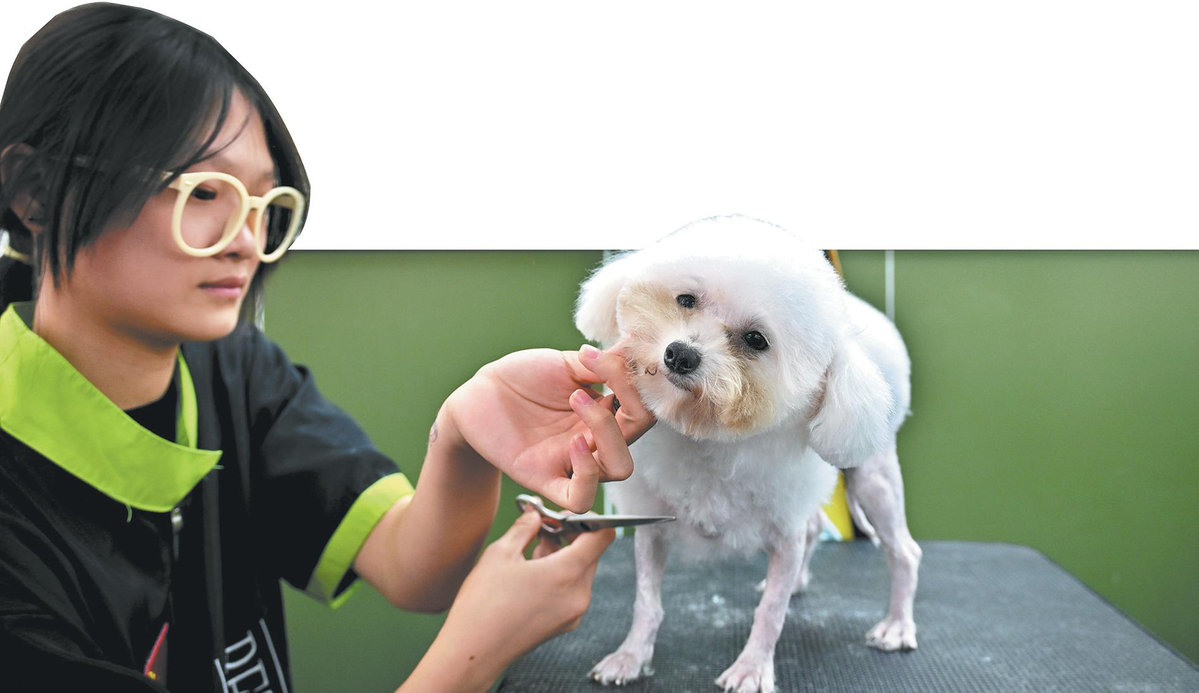 A trainee practices grooming a dog at Lele Pet Grooming School in Anshan, Northeast China's Liaoning province, on Oct 23, 2025. (HUA YUHAN / CHINA DAILY)