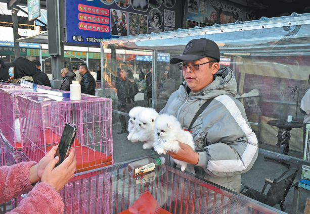 Vendors interact with customers through livestreaming at a pet market in Tiexi district, Anshan, Northeast China's Liaoning province, early in the morning of Oct 24, 2025. (HUA YUHAN / CHINA DAILY)