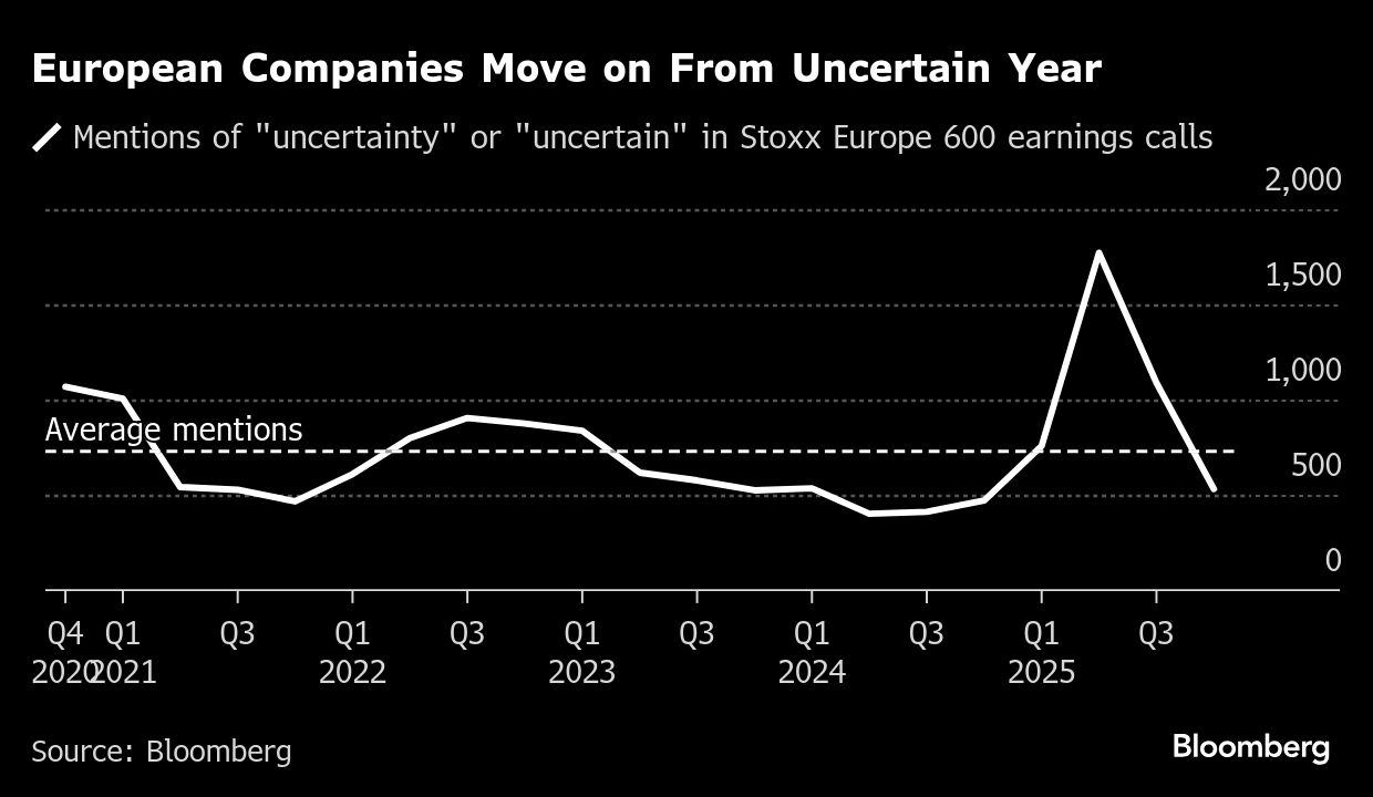 Mentions of “uncertainty” on European companies’ earnings calls slipped below the five-year average over the course of the third-quarter earnings season, and is at the lowest this year after peaking over the second quarter, a Bloomberg review of transcripts shows.