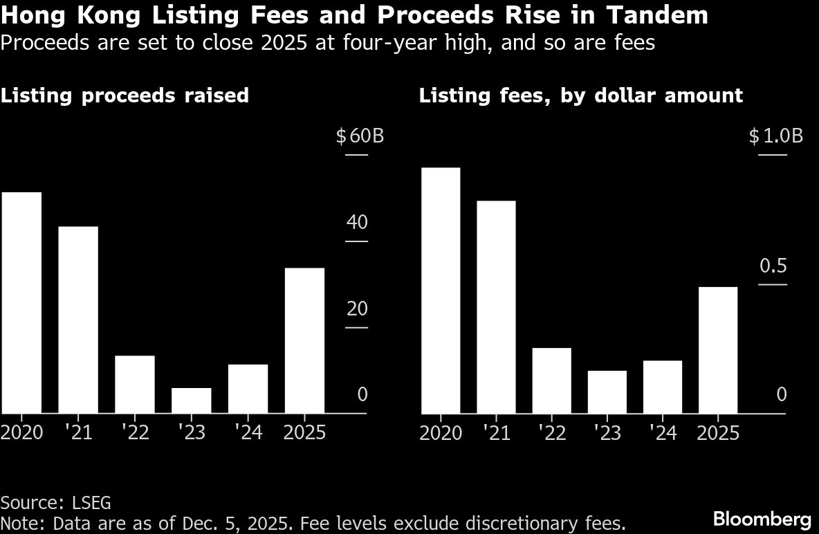 While fee rates fell, the dollar amount banks earned from Hong Kong listings this year has still risen along with overall deal volumes. The listings have generated $489 million of fees in 2025, on track for their highest since 2021, LSEG data show. Those numbers exclude the 1 percent brokerage fees charged to investors and any incentives companies may have paid on top of the base.