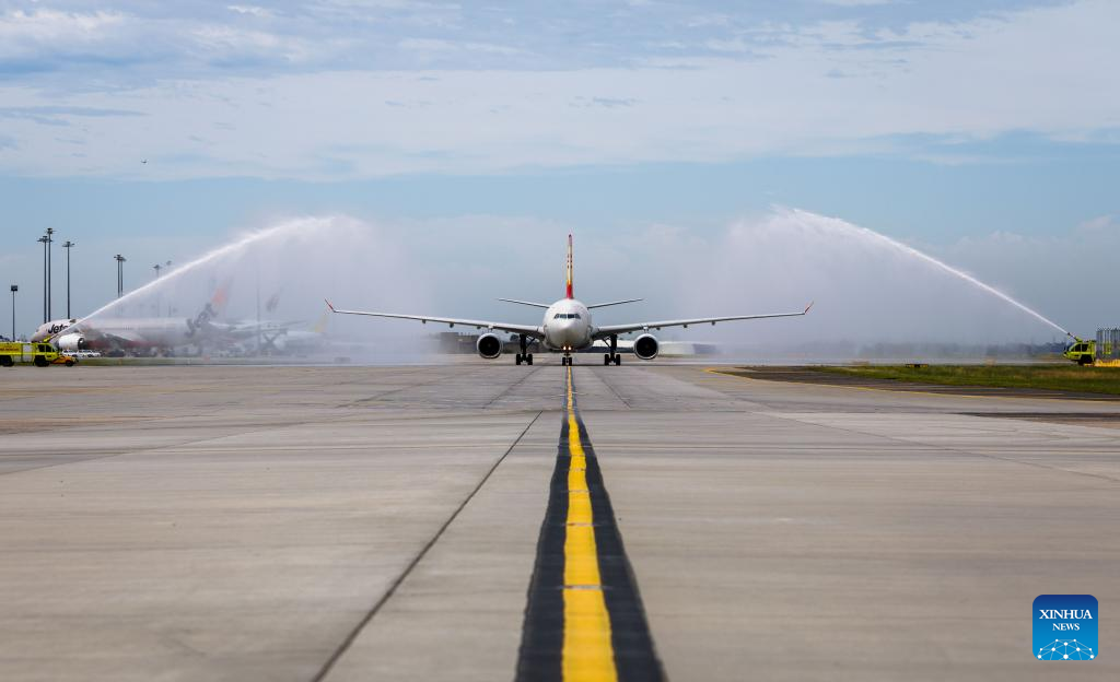 China's Hong Kong Airlines flight HX013 is welcomed by a water cannon salute upon arrival at the Melbourne Airport in Melbourne, Australia, Dec 13, 2025. (PHOTO / XINHUA)