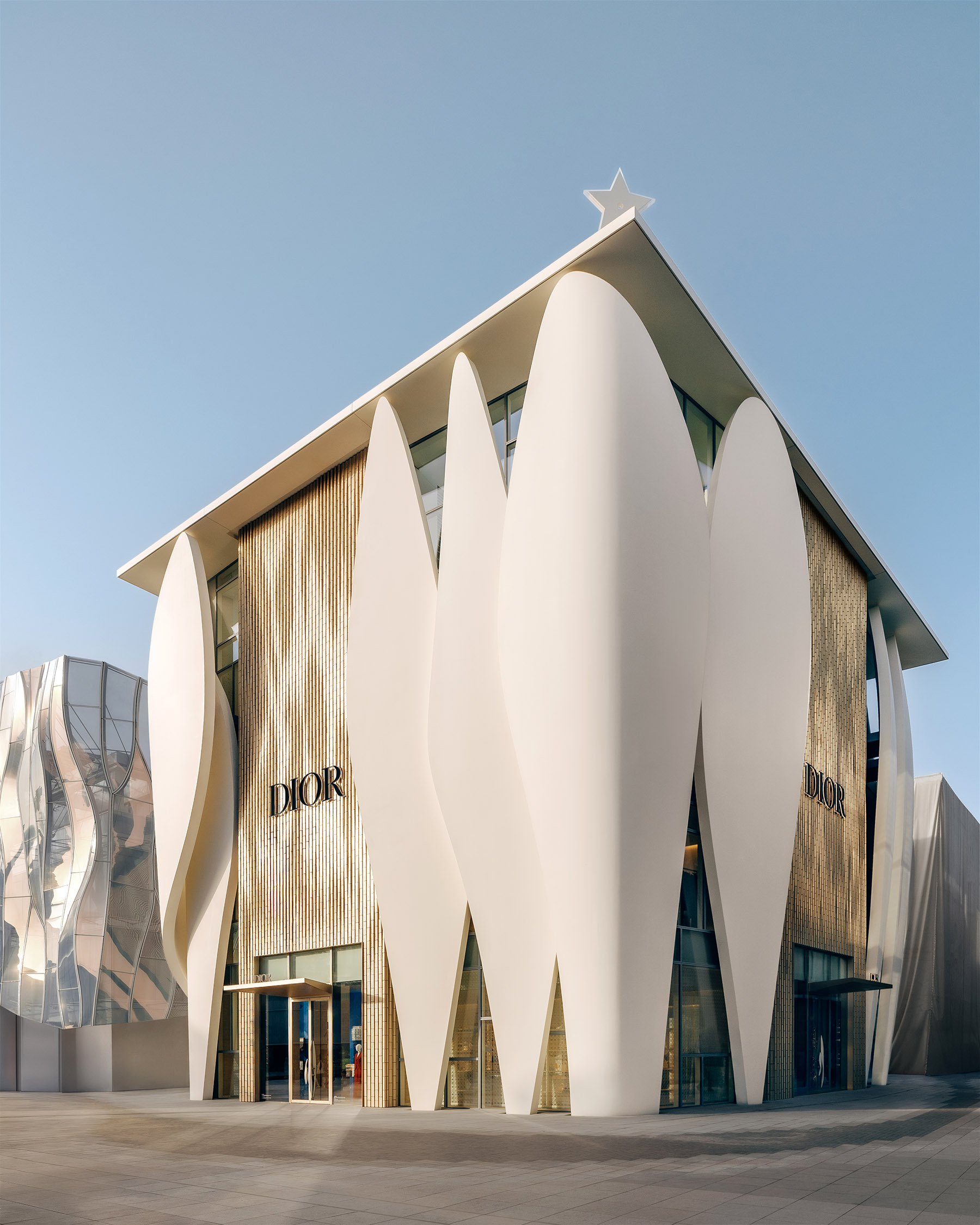 The House of Dior Beijing facade is embellished with ogival forms in the shape of petals with clean-cut lines, evoking the movement of the toiles Christian Dior was famous for in his haute couture dresses. The edifice is punctuated with golden artisanal glass tiles, a powerful color traditionally reserved for Chinese royalty in the ancient times.
