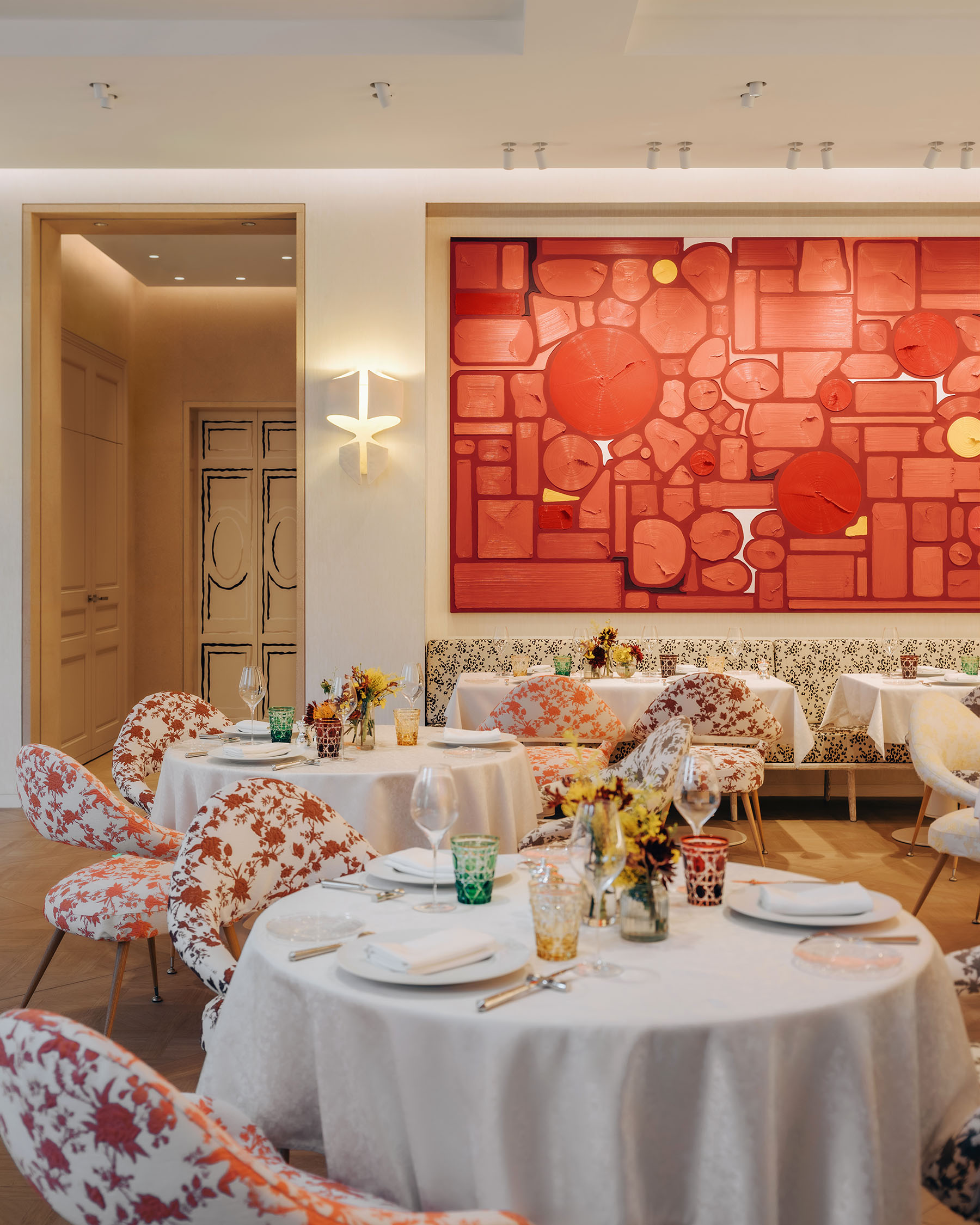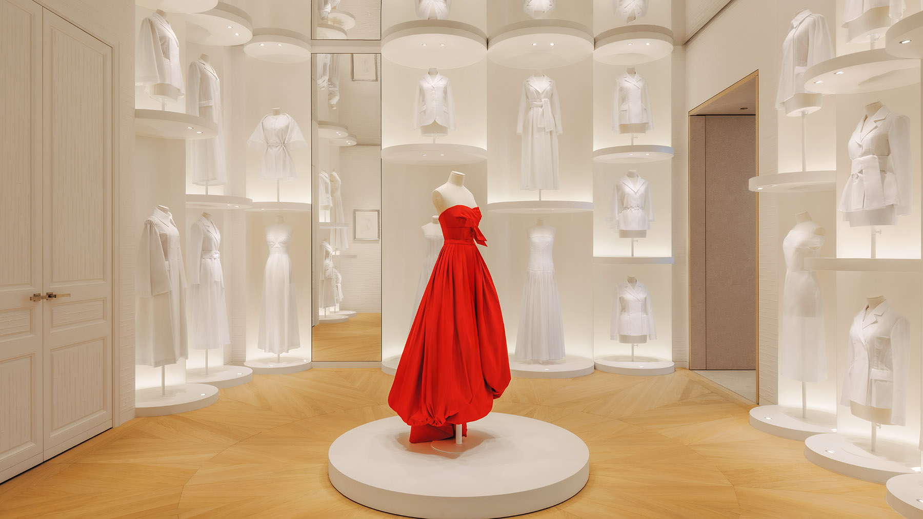 The journey continues to the top floor, which mirrors Dior's design flair at 30 Montaigne. A monumental spiral staircase elevates visitors to a room inhabited by white toiles, iconic three-dimensional outlines of garments, demonstrating the savoir-faire deployed in the Ateliers. Among them, a ball gown in deep red magnifies the decor's "color of life" — in Christian Dior's own words. VIP lounges and a private terrace add further exclusivity to this refined experience.
