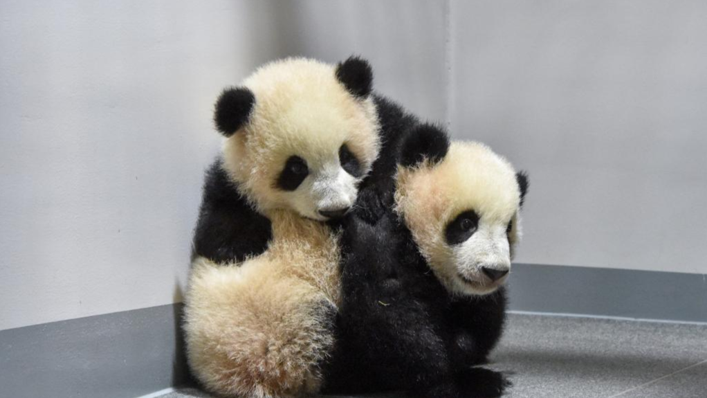 Photo dated Dec 13, 2021 shows twin giant panda cubs Xiao Xiao (back) and Lei Lei. (PHOTO / XINHUA)