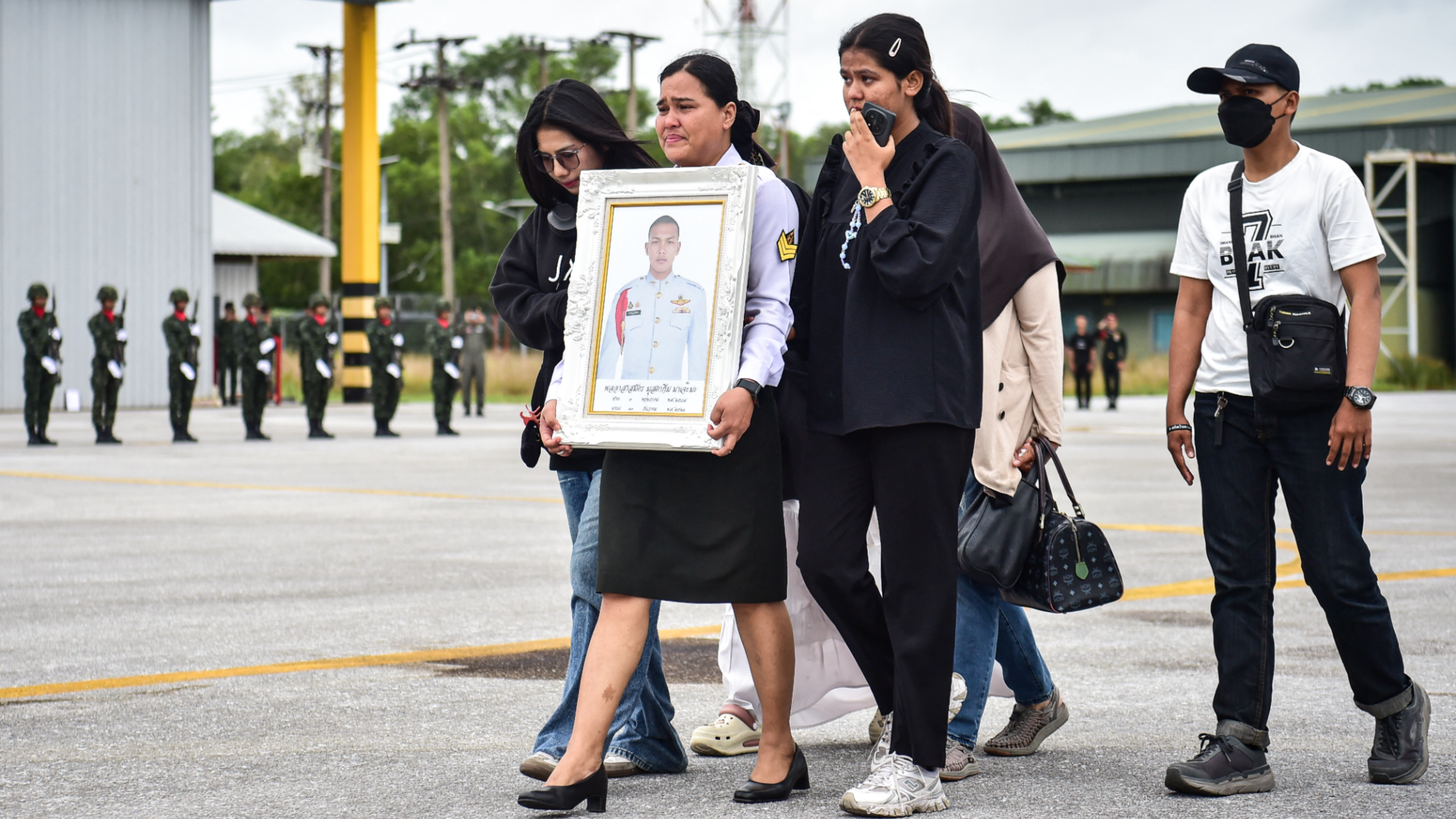 The mother and relatives of Special Forces volunteer Mustakim Majehma, who died amid clashes along Cambodia-Thailand border, walk with his portrait during a military ceremony at Narathiwat airport in Thailand's southern province of Narathiwat on Dec 14, 2025. (PHOTO / AFP)
