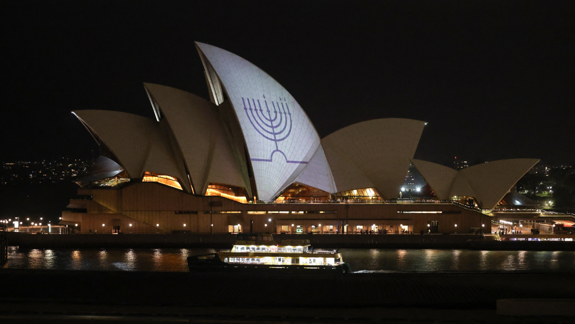 The Sydney Opera House was illuminated with a giant image of a Hanukkah menorah on Monday evening as thousands gathered in Bondi Beach to mourn the victims that included a Holocaust survivor and a 10 year-old child.