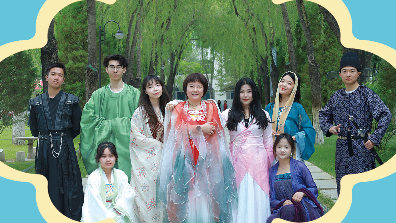 Zhang Mei (center) with key team members of the Dao Zhonghua Bilingual Cultural Communication Studio at North Minzu University in the Ningxia Hui autonomous region. (PROVIDED TO CHINA DAILY)