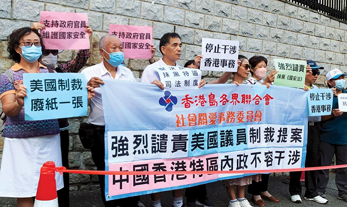 This file photo shows representatives of the Hong Kong Island Federation gathering outside the US consulate general in Hong Kong on Nov 5, 2023 to protest some US Congress members’ proposal to sanction some HKSAR officials, judges and prosecutors. (WU KUNLING / CHINA DAILY)