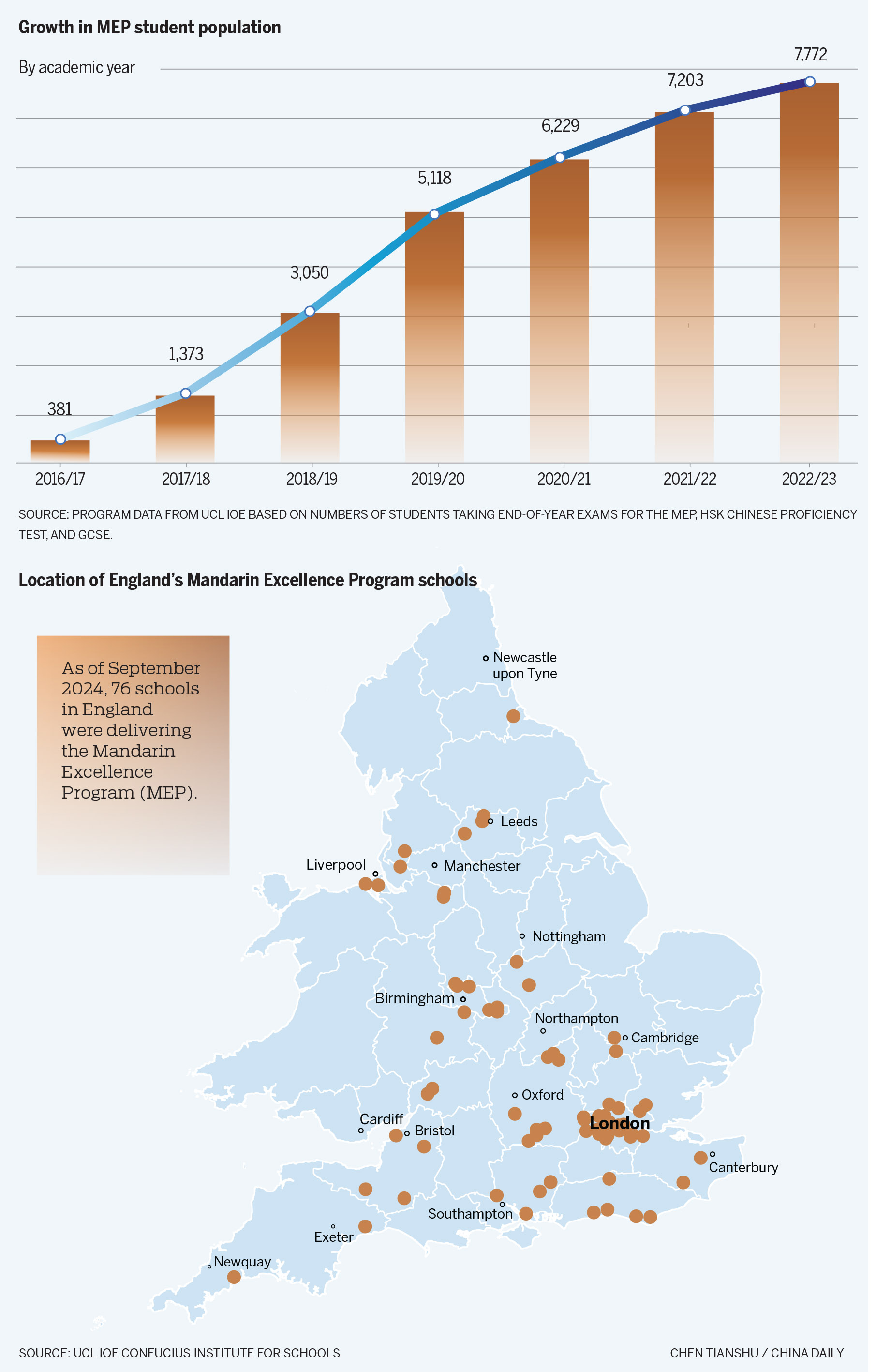A September report by the British Council noted that Mandarin is one of the few languages to have "significantly increased" in provision during the past decade. Entries for the General Certificate of Secondary Education, or GCSE, in Mandarin, rose from a little more than 3,000 in the 2012-13 academic year to more than 7,800 in 2023-24.