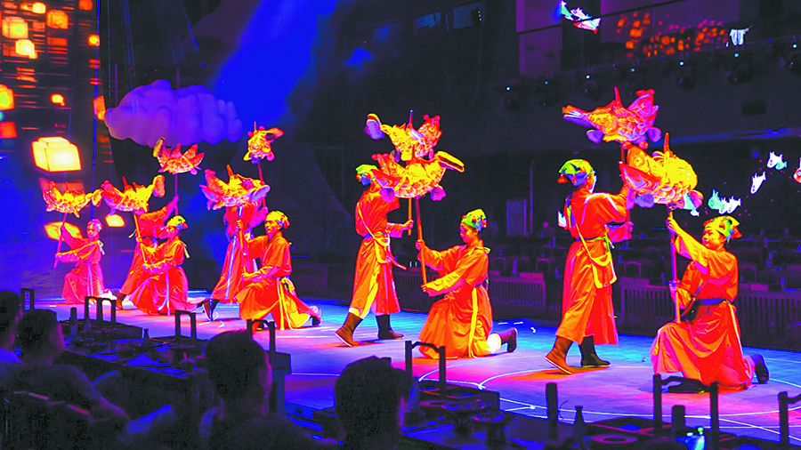 The stage then erupts with the Jianzhou fish-dragon dance, with actors weaving through the tables with glowing fish lanterns, as carp transform into dragons and leap over the "dragon gate" on the giant screen.