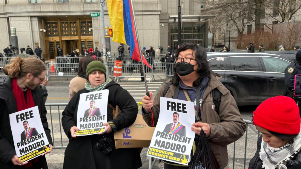 Protesters gathering outside the court were shouting slogans and holding banners of "Free Maduro," "No War on Venezuela," and "USA hands off Venezuela."