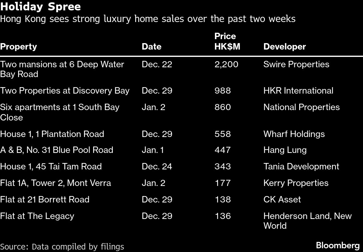 Among the deals, Swire Properties Ltd scored the highest price tag, offloading two mansions at Deep Water Bay for a total of HK$2.2 billion ($283 million) in one of the largest transactions in recent years. HKR International Ltd sold a pair of houses next to its golf club at Discovery Bay for almost HK$1 billion.