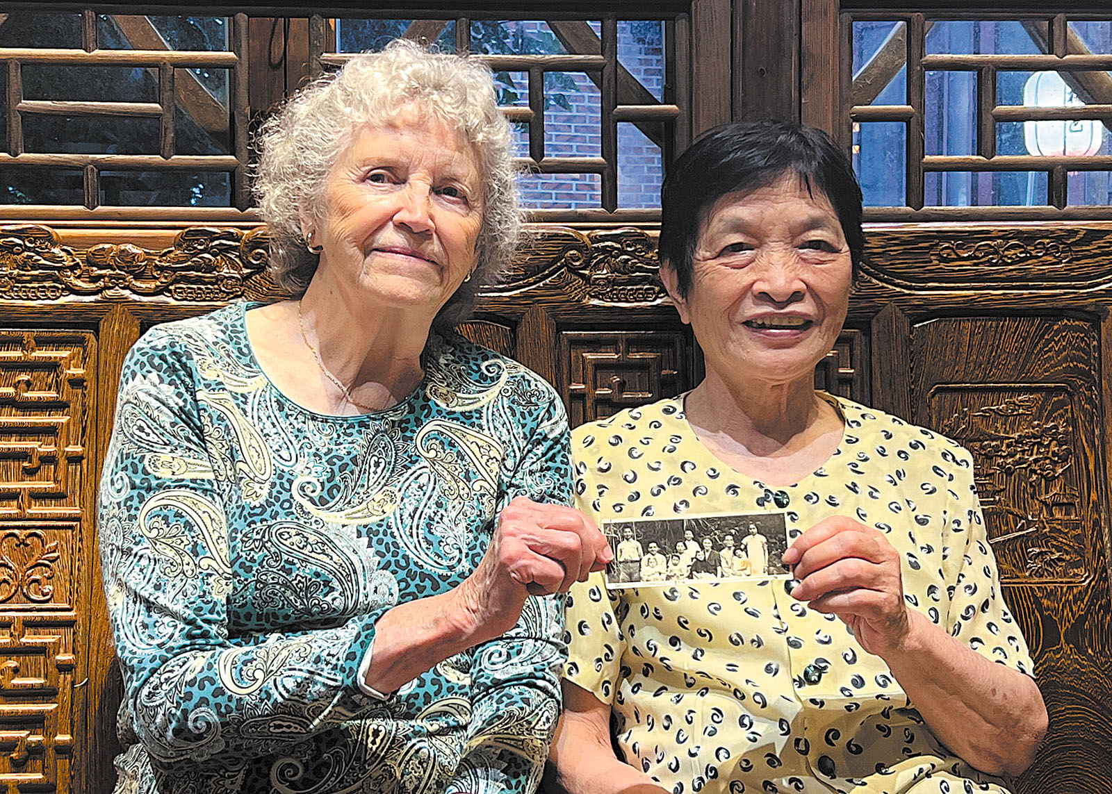 Gail Harris (left), whose Chinese name is Bi Lehua, and Li Yiying pose for a photo together while holding a photograph from their childhood during the Bond with Kuliang: 2023 China-US People-to-People Friendship Forum in Fuzhou, Fujian province. (PROVIDED TO CHINA DAILY)