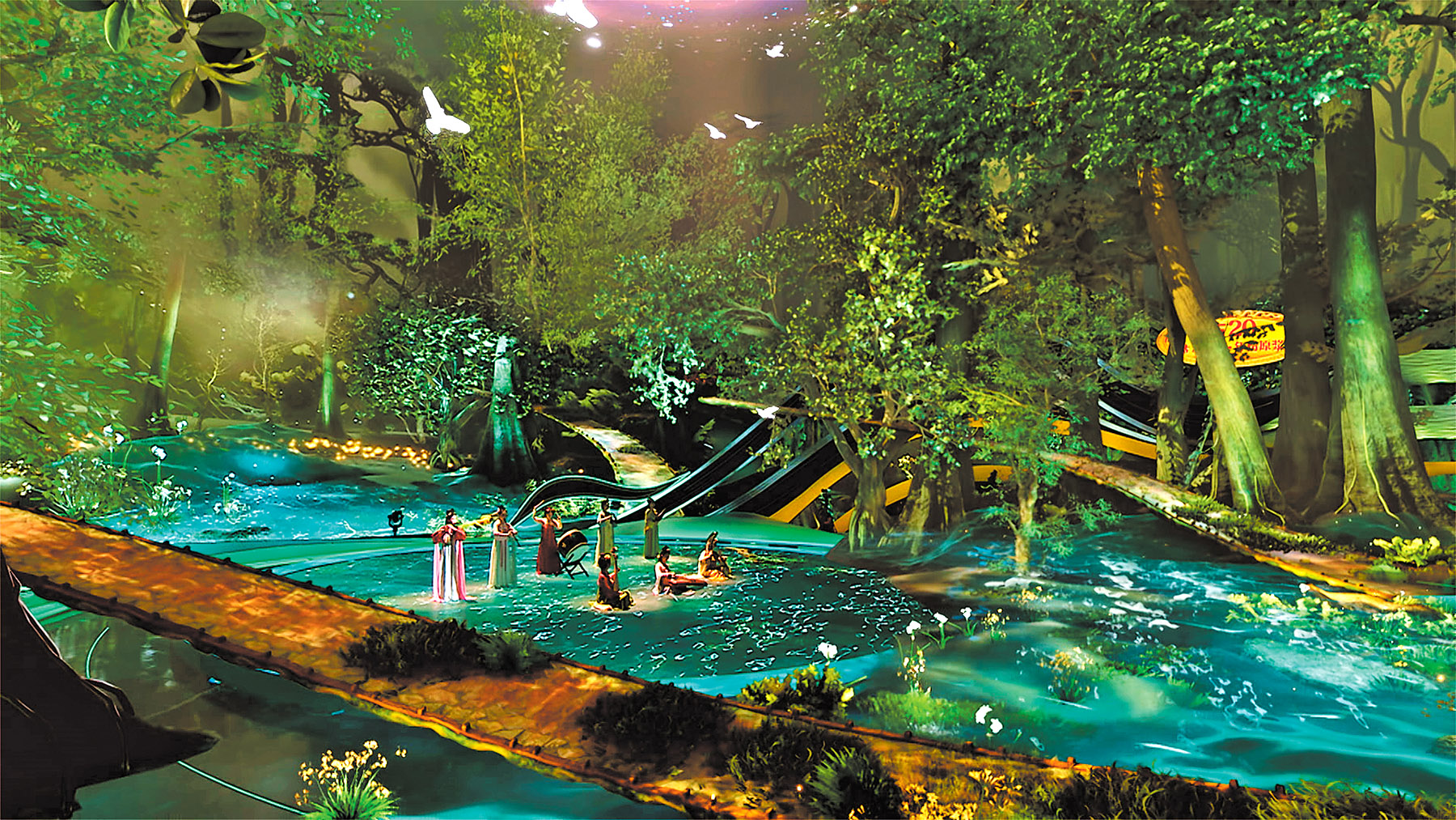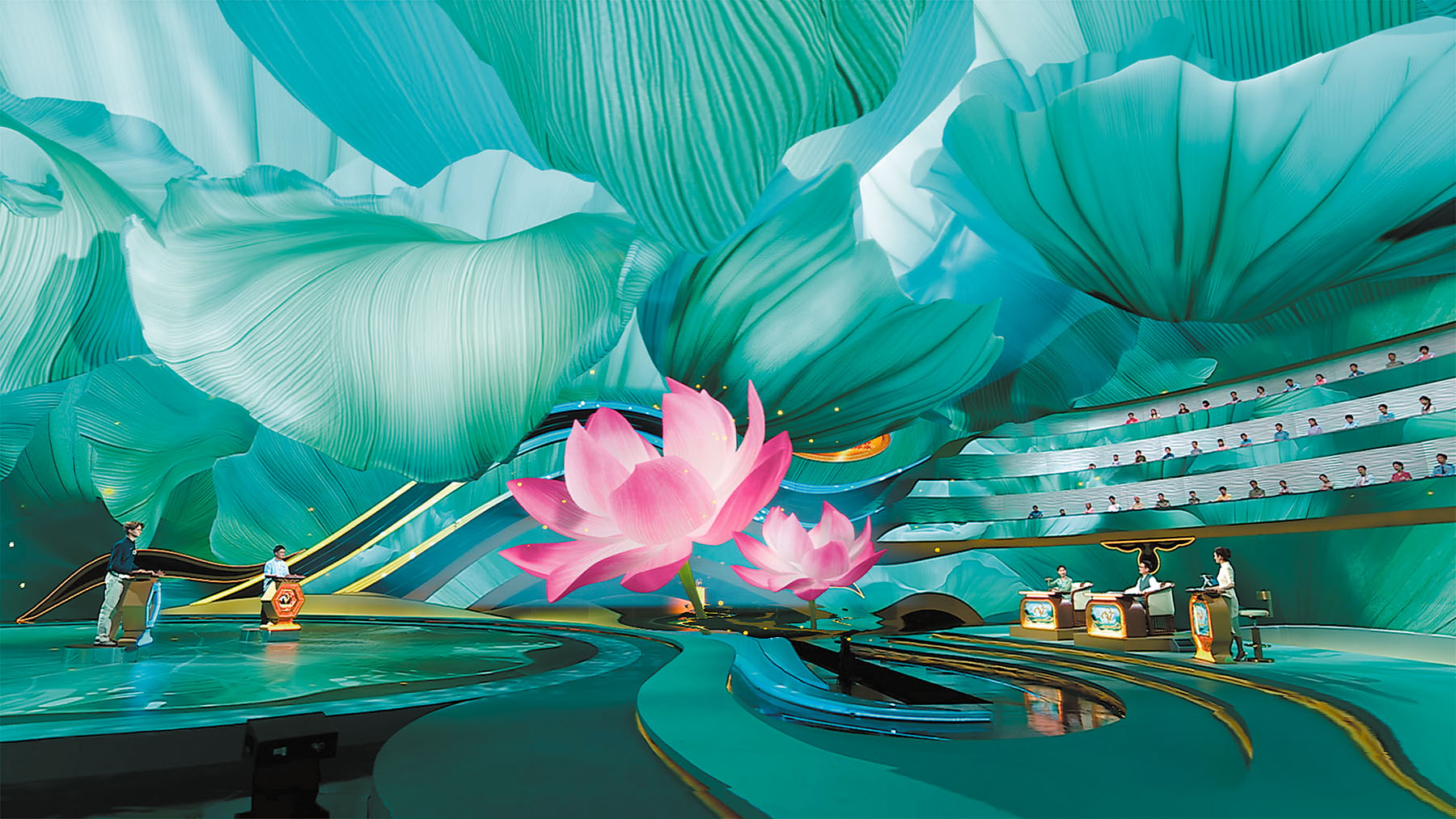 On stage, surging waves and a soaring dragon form a striking centerpiece. The dragon's translucent, flowing body is animated using fluid dynamics algorithms, while its skeletal structure, textures and lighting are generated in real time through physical calculations, resulting in seamless, dynamic visuals.