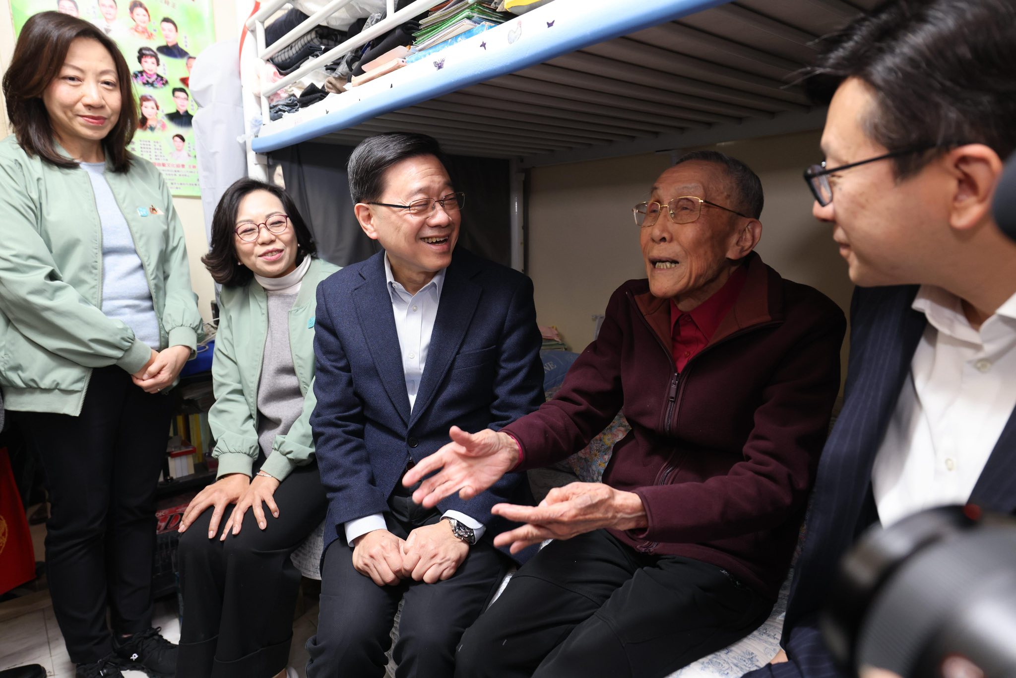 In this photo released on Hong Kong Chief Executive John Lee Ka-chiu's social media page, Lee (third left), accompanied by Secretary for Home and Youth Affairs Alice Mak Mei-kuen (second left) and Secretary for Labour and Welfare Chris Sun Yuk-han (first right), visits an elderly person who lives alone during his year-end caring community visit in Hong Kong on Feb 13, 2026.
