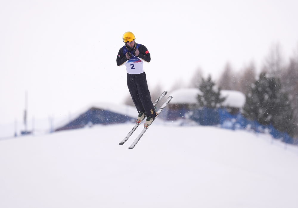 Wang Xindi of China competes during the freestyle skiing men's aerials qualification 1 at the Milan-Cortina 2026 Olympic Winter Games in Livigno, Italy, Feb 20, 2026. (PHOTO / XINHUA)
