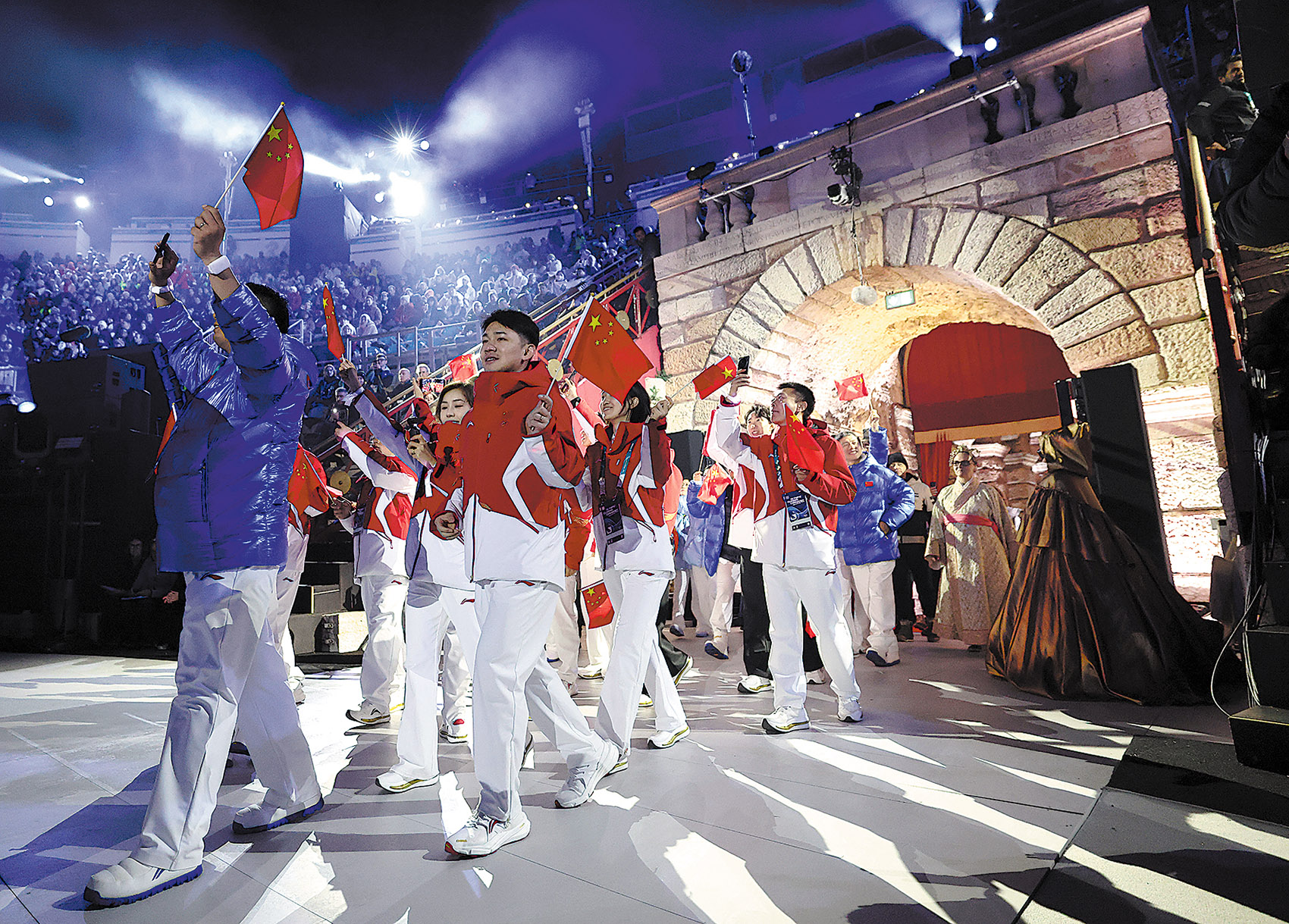 The Chinese delegation parades in the arena during the closing ceremony of the Milano-Cortina 2026 Winter Olympics on Feb 22, 2026 at Verona Olympic Arena in Verona, Italy. (PHOTO / XINHUA)