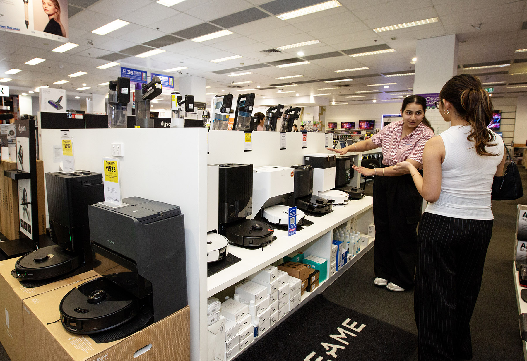 A shop assistant gives details of Chinese robot vacuum cleaners to a customer at a home appliance store in Sydney, Australia, on Oct 13, 2025. (PHOTO / XINHUA)