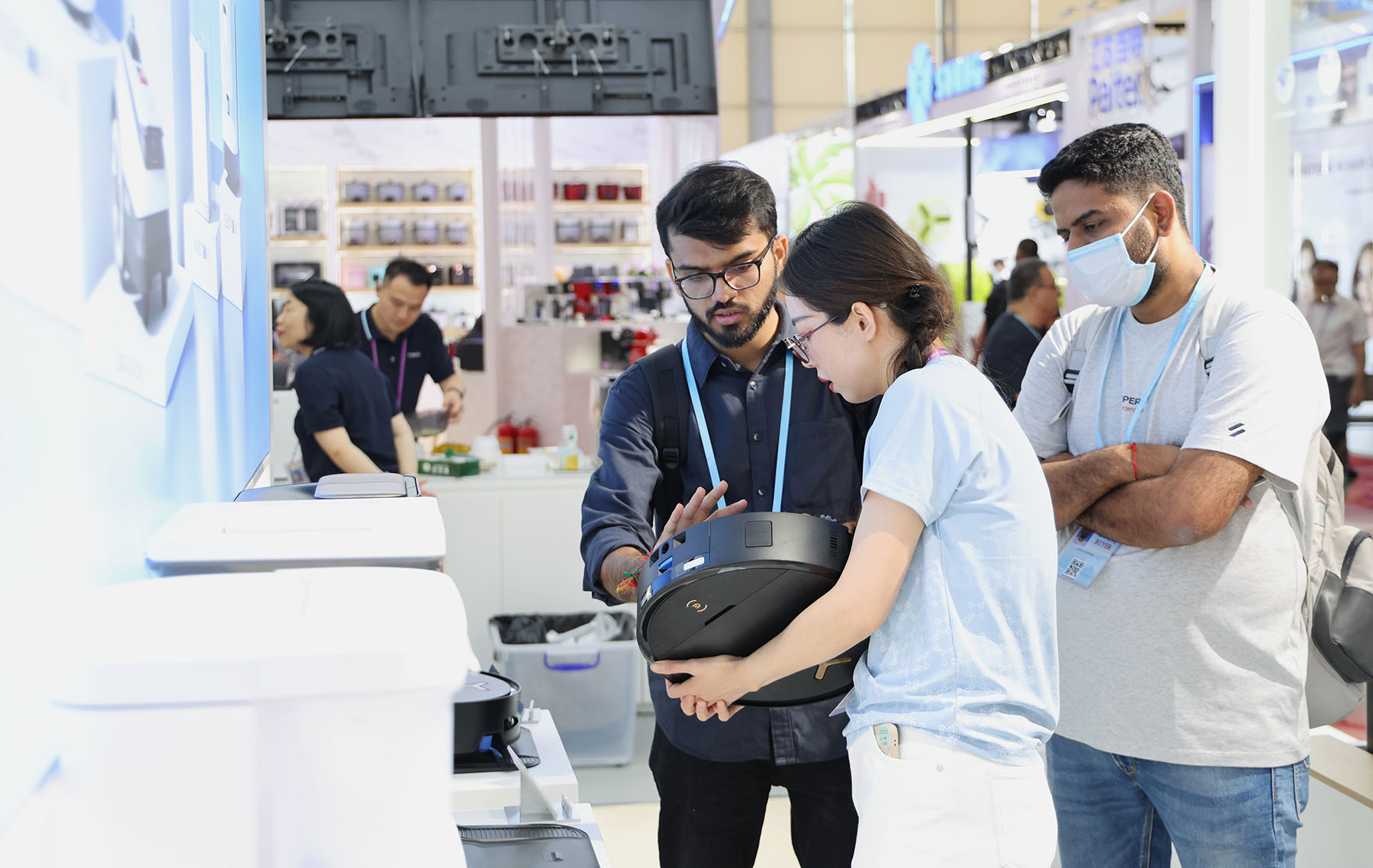Customers learn about Chinese robot vacuums at the Canton Fair in Guangzhou, Guangdong, on April 16, 2025. (PHOTO / XINHUA)