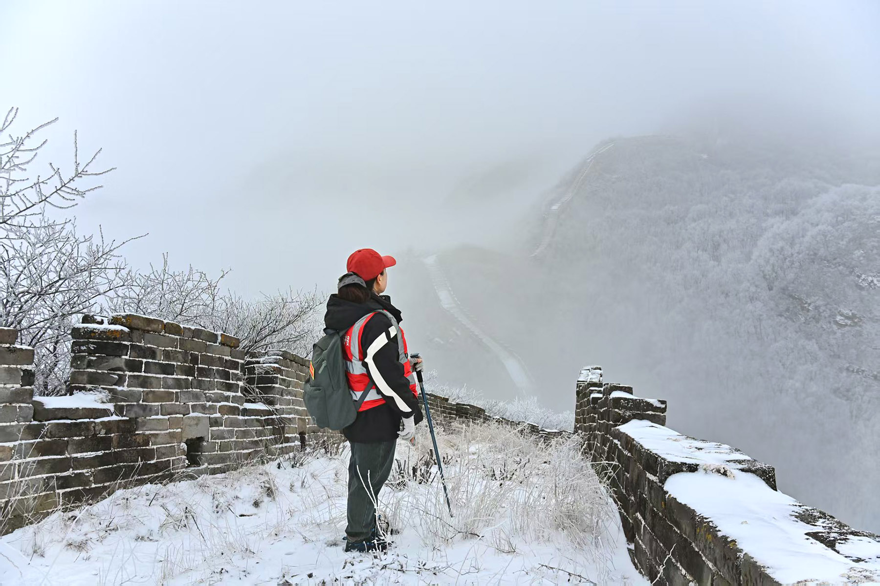 Liu Hongyan patrols the Great Wall after a snowfall and photographs the rime-covered scenery. (PROVIDED TO CHINA DAILY)