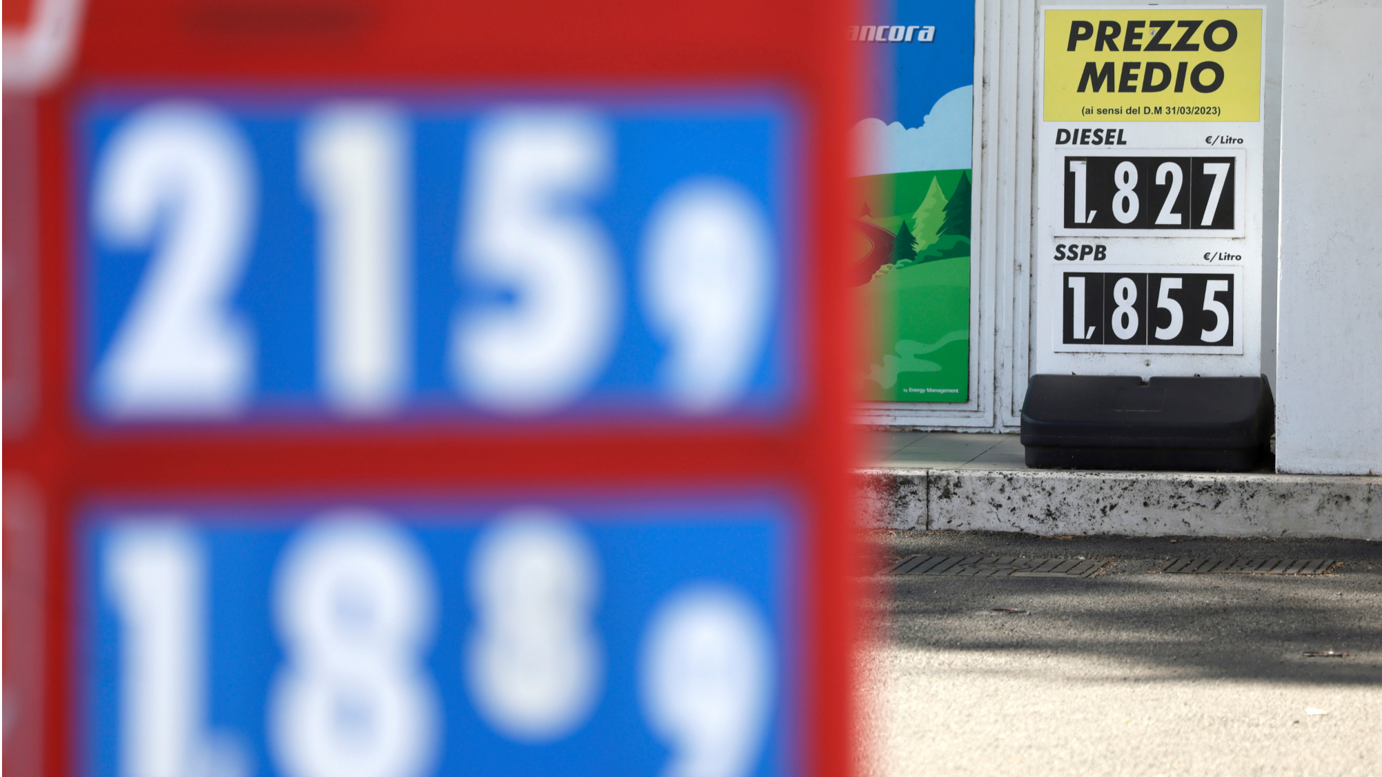 A sign in the background shows the average price of diesel, top and petrol, as the current price is seen in the foreground, at a petrol station in Rome, Italy, March 19, 2026. (PHOTO / AP)