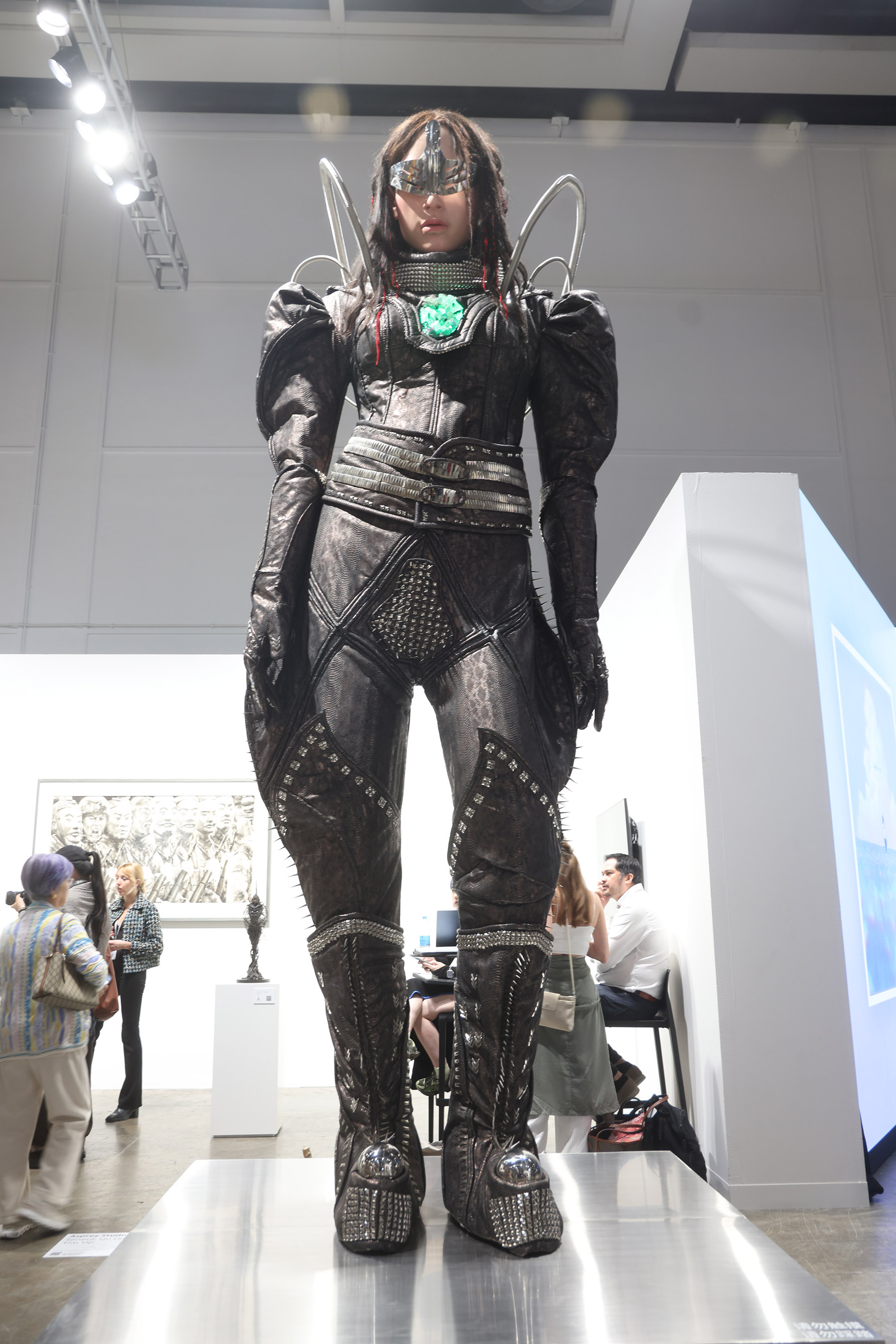 The artist says he used leather sourced from space to craft Lili’s astronaut suit. “Everything Lili needs is self-sufficiently provided within the garment itself. The most crucial element is the light emitting from the gemstone on her chest. This crystalline jewel can gather the mind’s messages and transmit them throughout the spaceship, becoming a language through which intention can reshape reality.”