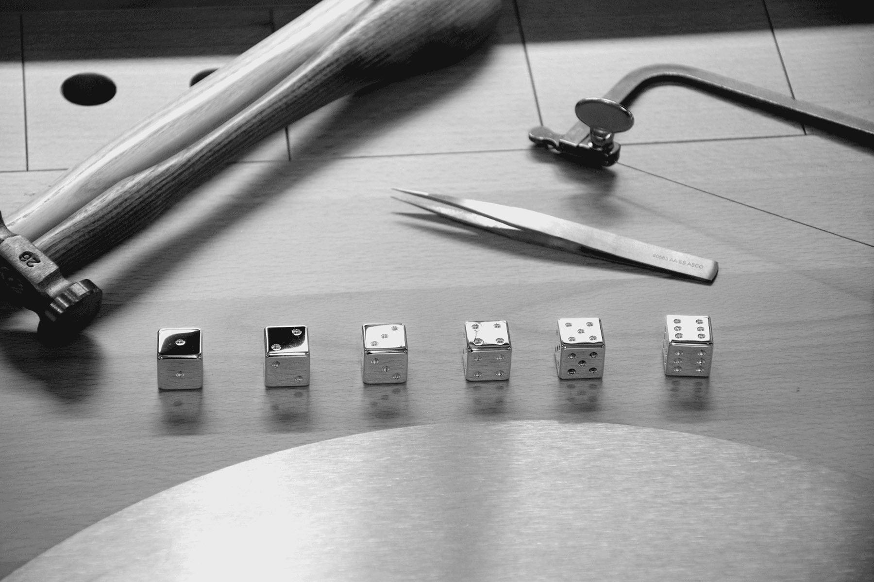 Luck comprises a silver dice set of six, each with the same number of dots on every face, while Play invites viewers to roll them, receive a random set of transparent resin replicas, and trade the duplicates with strangers to complete the sequence of one through six.