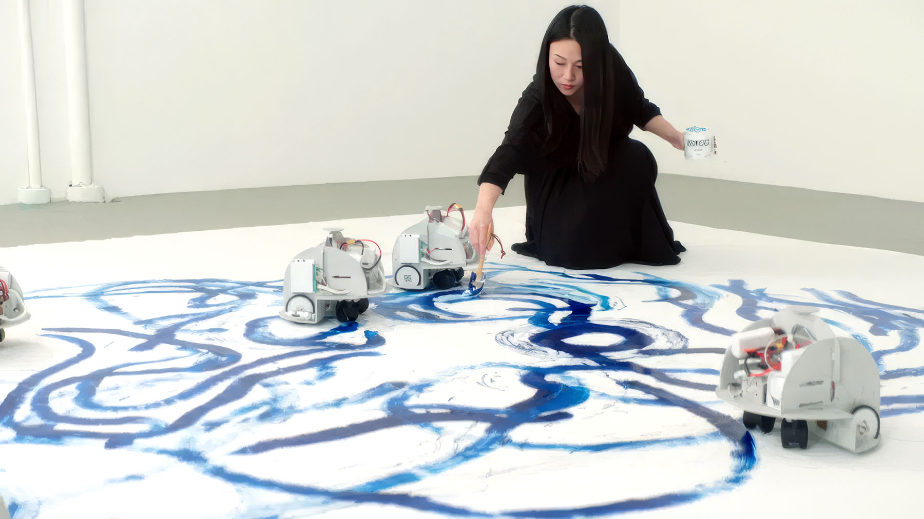Chung turns her negotiations with AI tools into a live performance. The highlight of her ABHK showcase, titled Recursions, is live painting sessions — a visual dialogue between Chung and a kinetic robotic system trained on decades of her gestural data responding to each other by making marks on a scroll, a bit like two musicians engaged in creative jamming.