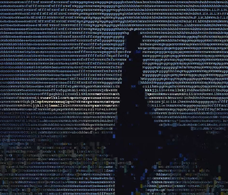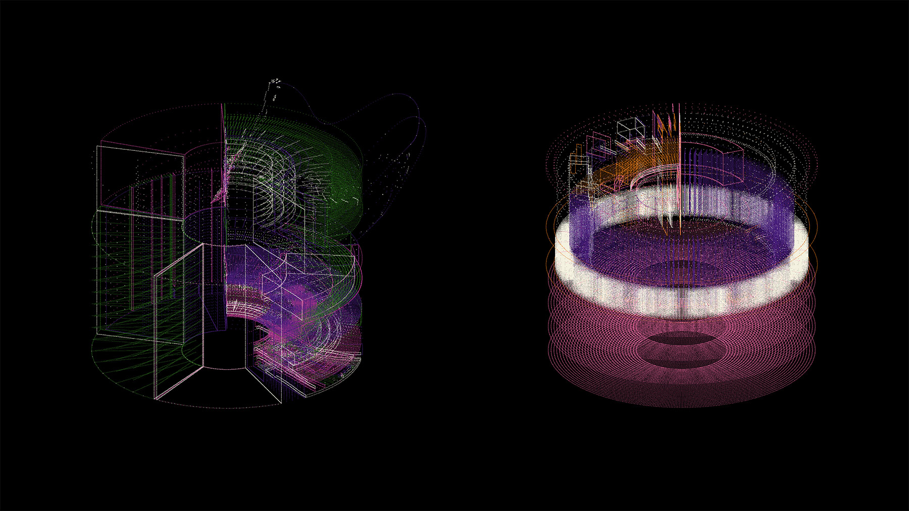 Similar in ethos to Asendorf’s piece, in Silver’s Mary’s Room series of generative blockchain artworks, minuscule twinkling digital units alternatively reveal and obfuscate a mysterious figure standing on a mound by the sea. On close inspection, these light sources turn out to be a million repetitions of the ASCII code “010”, which is of critical importance to computing, and also a nod to the exhibition sector’s title. The figure in the image is of course yet another proxy for the artist who has talked in previous interviews about standing on a cliff edge and feeling connected to the space-time continuum.