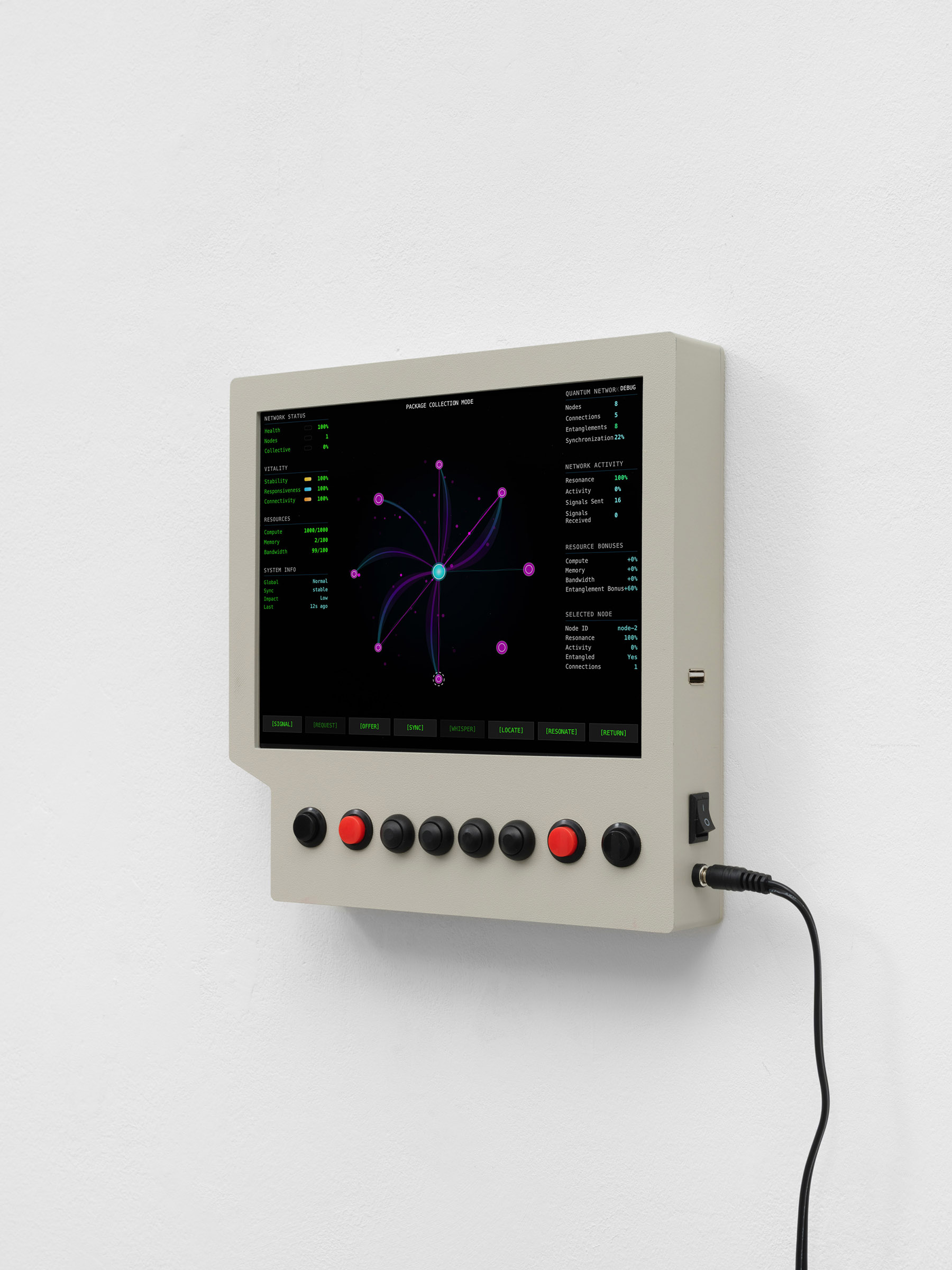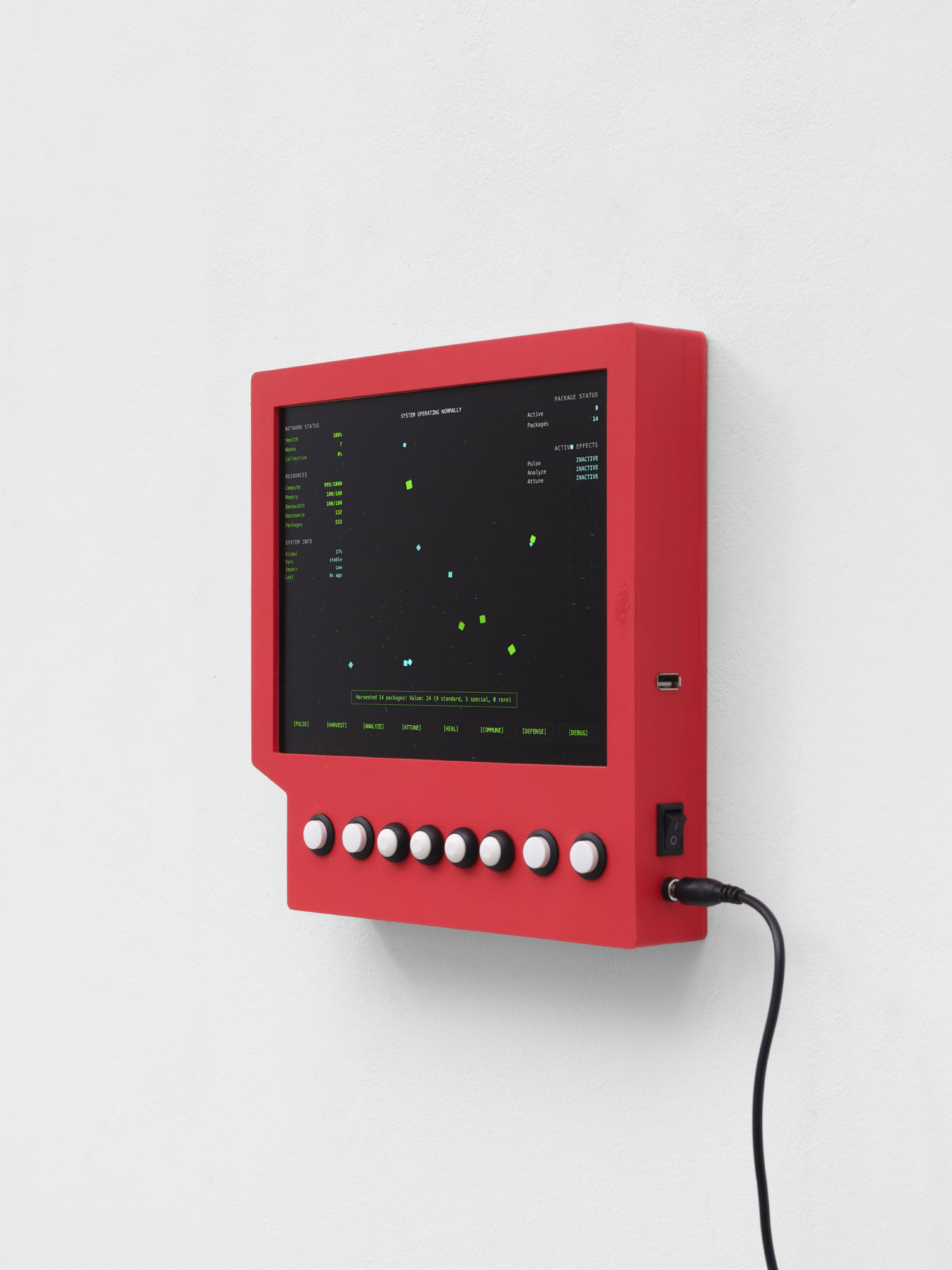 A number of works in Zero 10 are about revisiting and/or reinventing objects, themes and ideas from the past — both ancient times and the predigital era. Daniel Canogar’s (Bitforms Gallery) illuminated panels — a homage to traditional diorama showcases — are in fact generative sculptures fed on environmental and climatic data. The wall-mounted flat-screen monitors with dark screens and words written in eight-bit pixelated-style fonts in Jonas Lund’s (Office Impart) Network Maintenance bring to mind an earlier generation of personal computers. Robert Alice’s Seal draws attention to the fundamental similarity of intent and purpose between ancient Chinese seals and NFTs — both being incontrovertible indicators of ownership — by inviting collectors to generate personalized cryptographic seals.