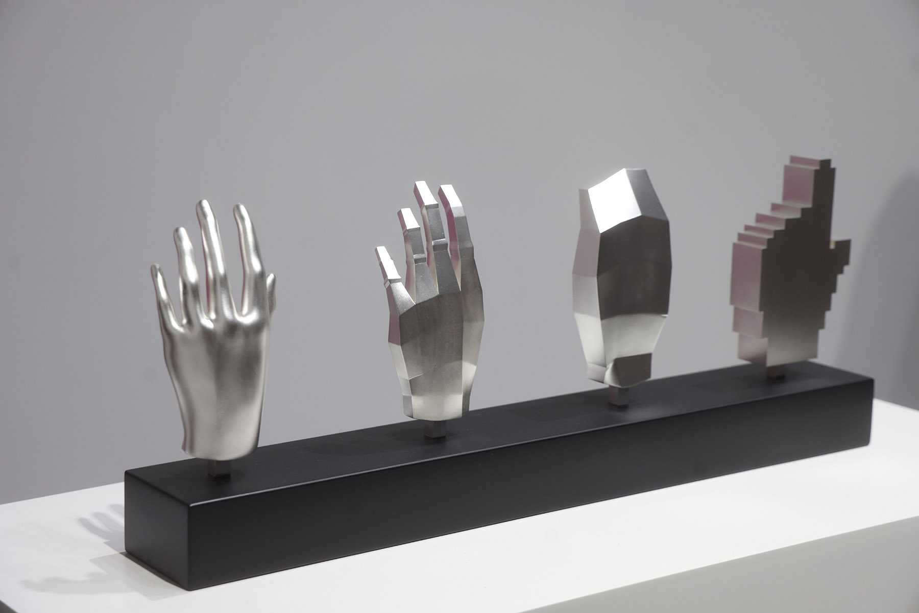 Work is a set of four hand-shaped sculptures, made of sterling silver, showing a progression from the human hand to the digital cursor. It is the artist’s attempt to apotheosize the role of human labor at a time when it is increasingly being replaced by technology — make the systems supporting the migration of work from the body to the screen visible in the form of sculptures representing different stages of this journey.